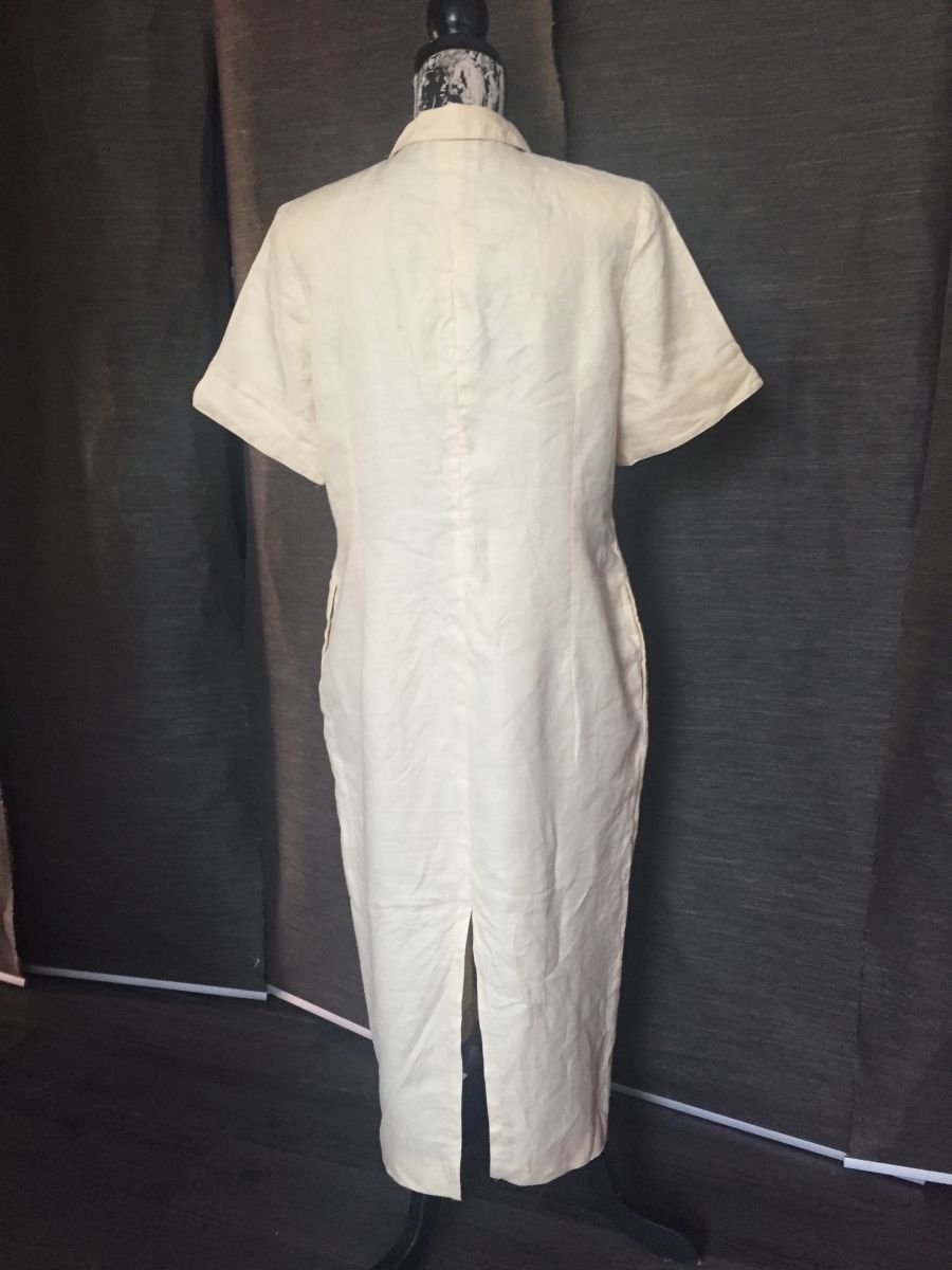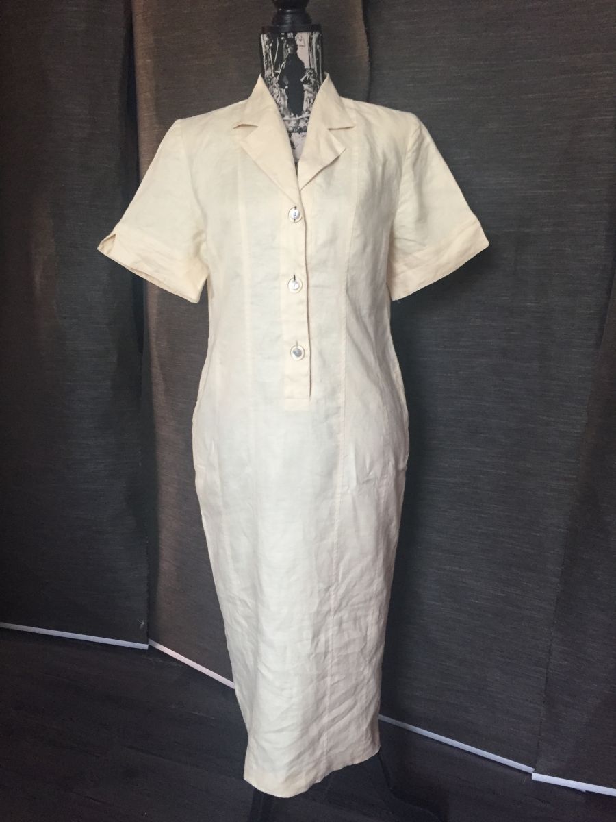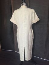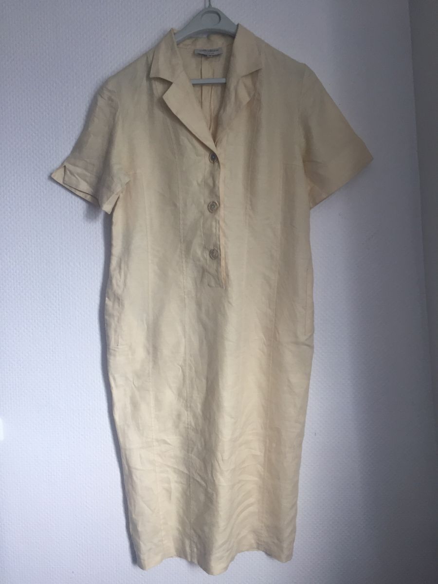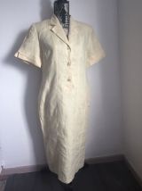 Jolie robe 100% lin jaune clair longue et boutonnée sur le devant, fendue derrière.