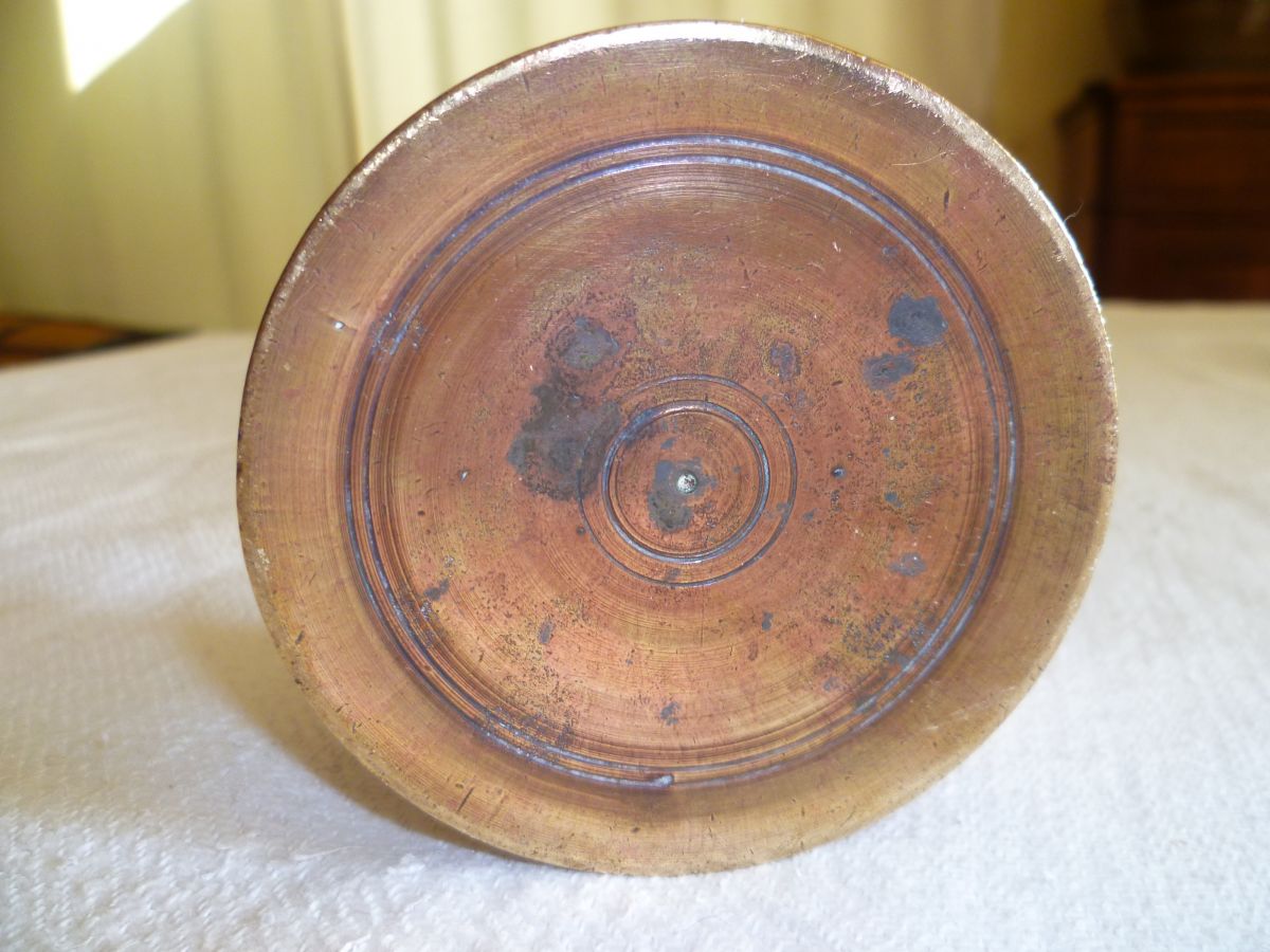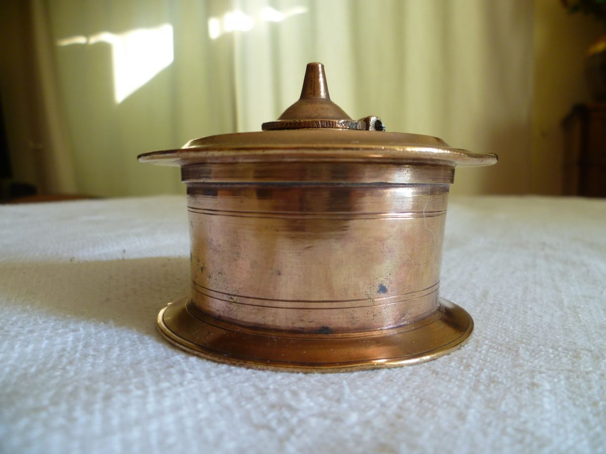 Encrier cuivre massif 563 g, rapporté des indes, il y a 40 ans, diamètre 8,3 cm, hauteur totale 7 cm, hauteur cuve 5 cm,
