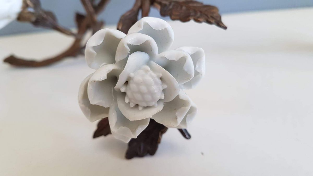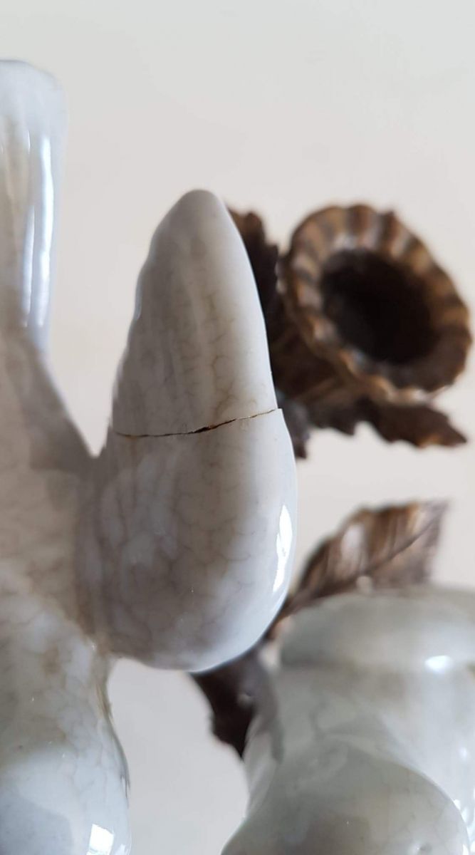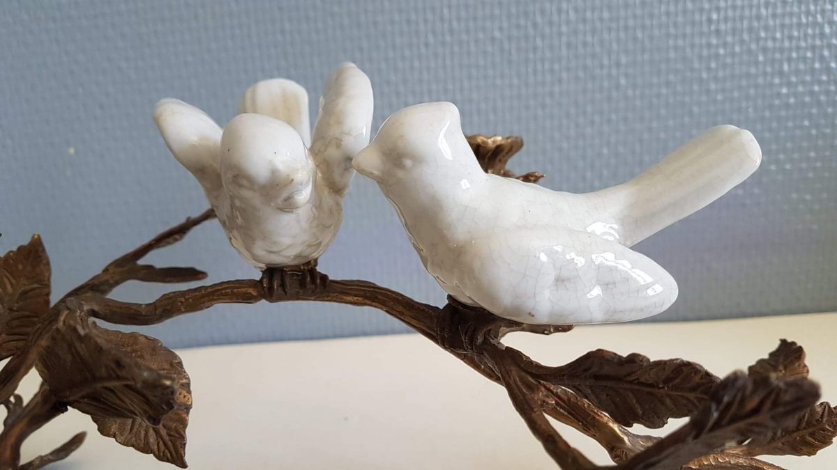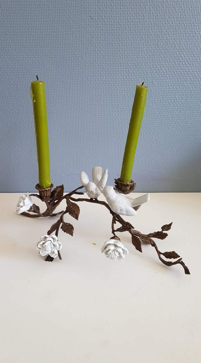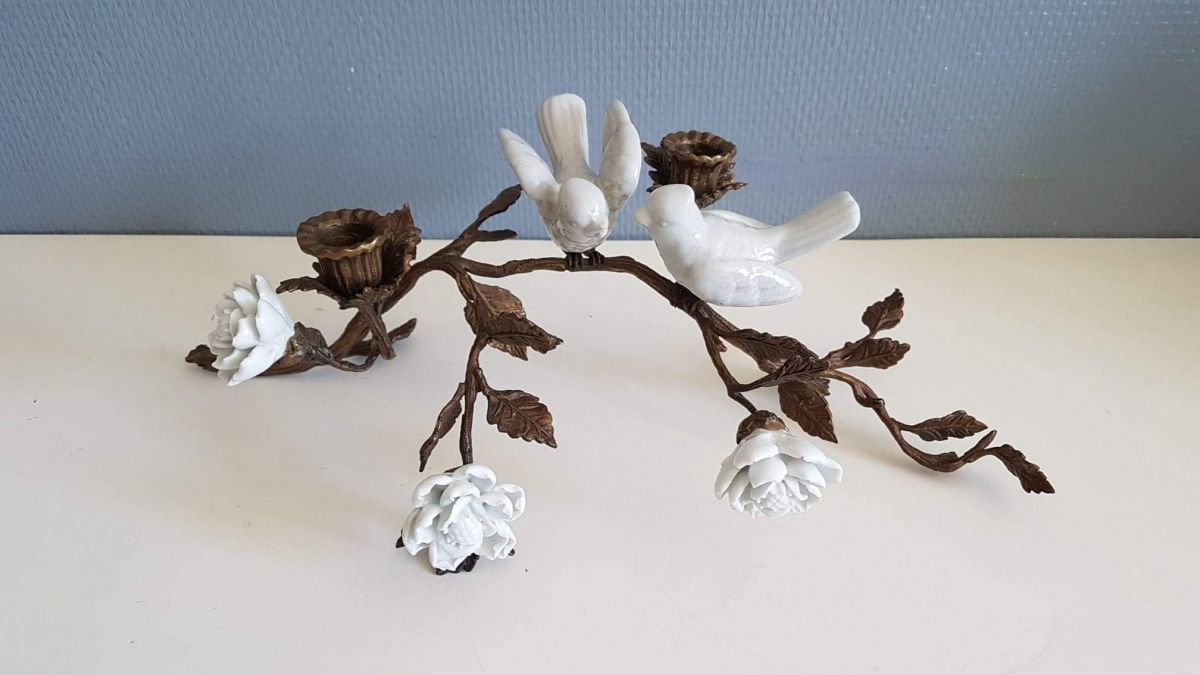 bougeoir art nouveau , branche en bronze, oiseaux et fleurs en porcelaine blanche