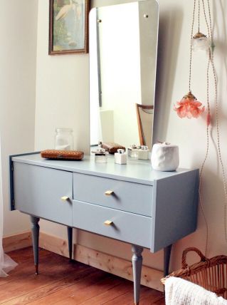 Jolie petite coiffeuse des années 60, peinte dans un bleu-vert, puis recouverte d'un vernis mat afin de faciliter l'entretien.