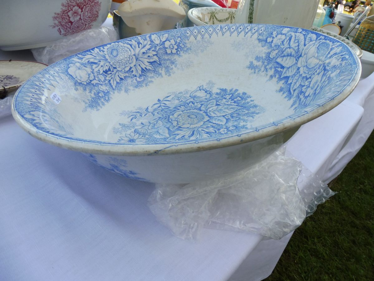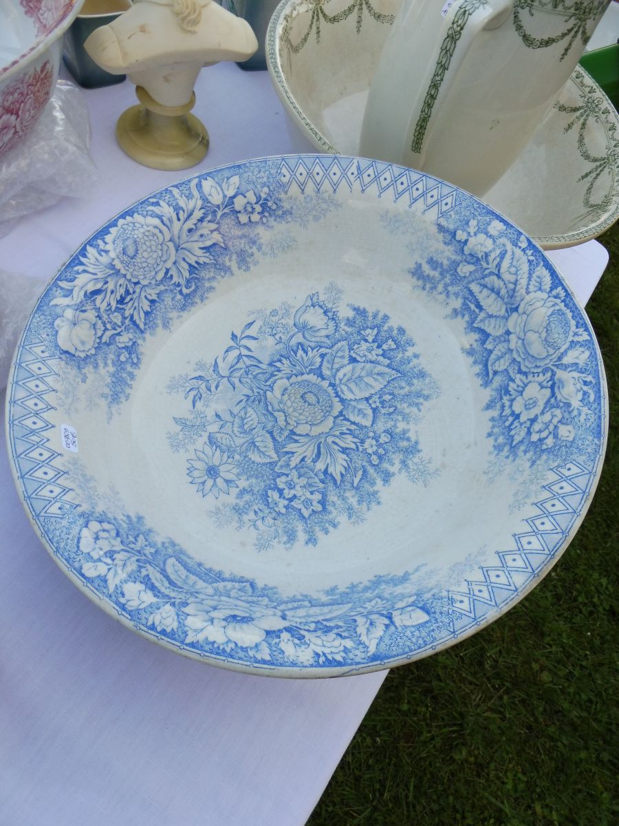 Superbe jardinière de 47 cm de diamètre , 1930, tons bleus lumineux , aucun fêle , parfaite pour déco, fleurs ou plats de service en famille, très beau sur une table en présentation. Bel achat !