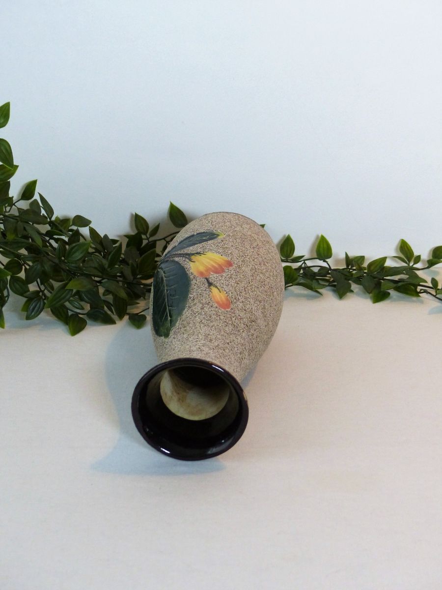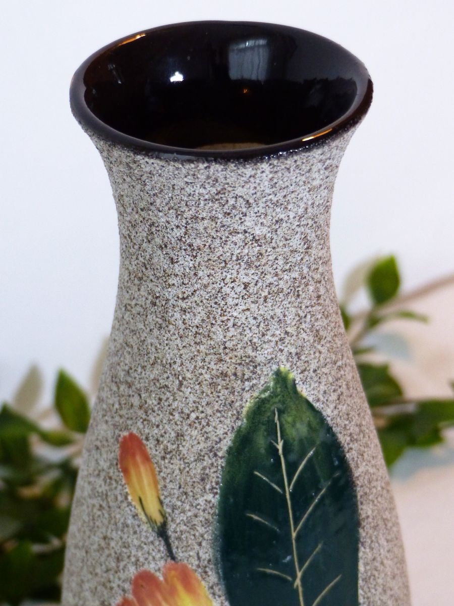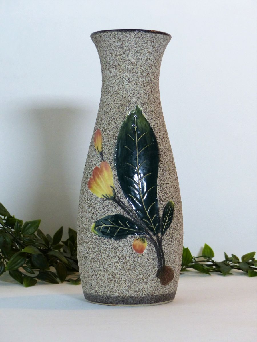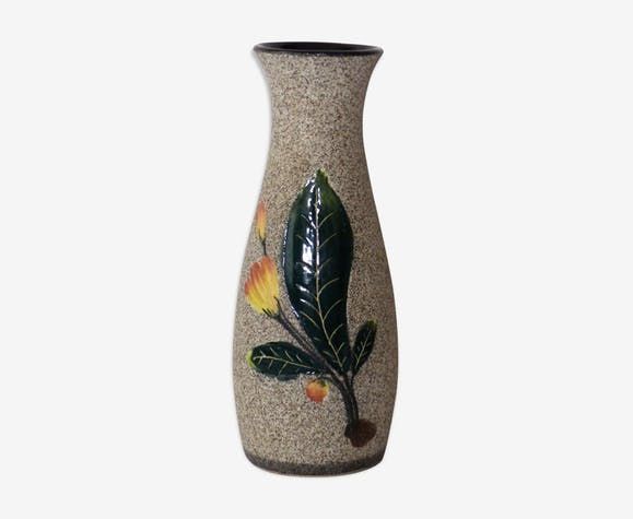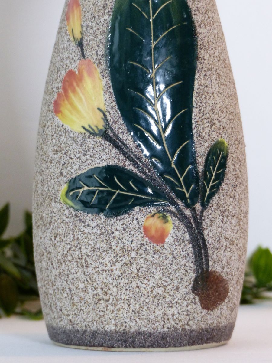 Joli vase en grès, extérieur aspect rugueux, décor floral en céramique. Léger manque de peinture sur le col. Dimensions : Diamètre 10 cm, hauteur 28 cm.
