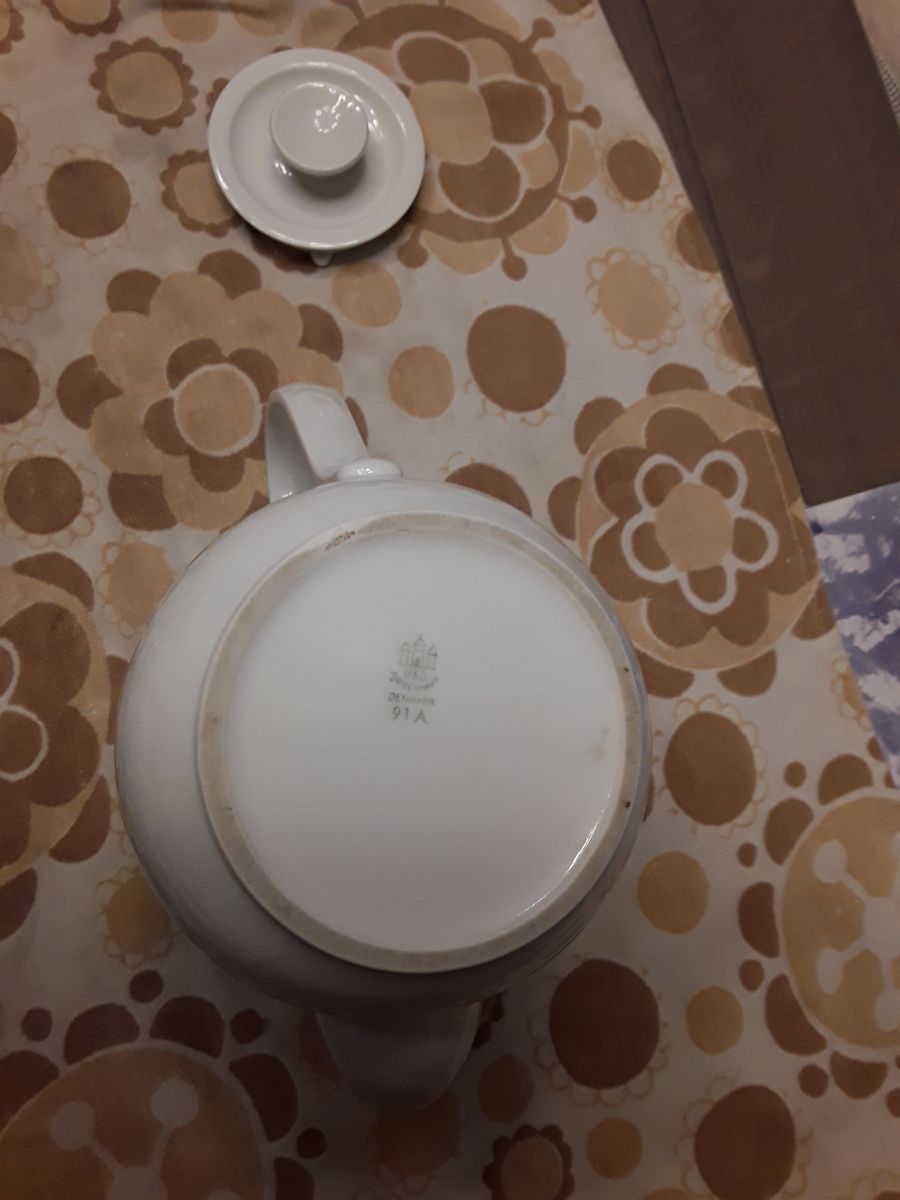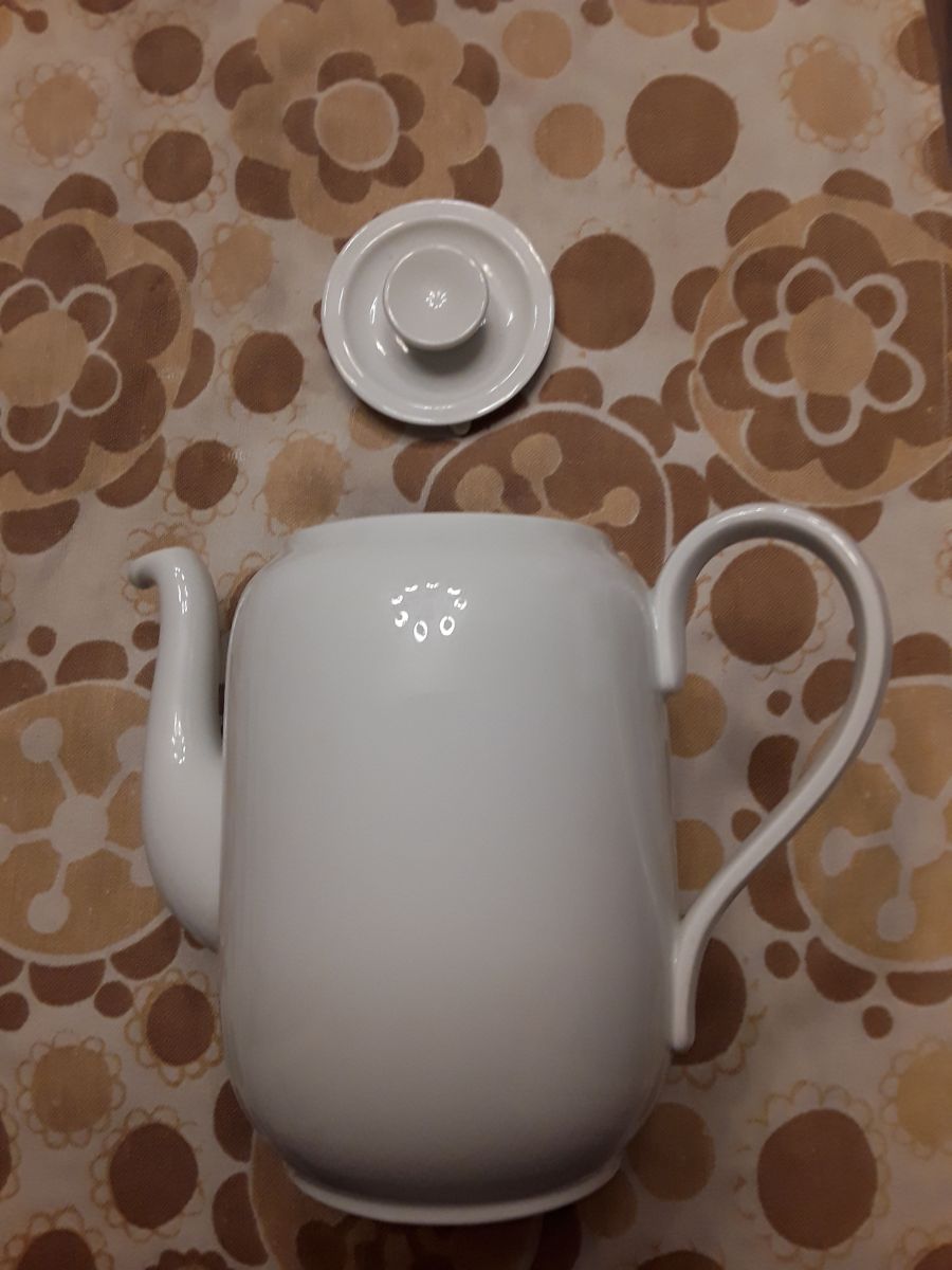 Vends théière danoise vintage en porcelaine blanche. Annees 70. Hauteur 17 cm et diamètre 12 cm contenant 1 litre. Bec verseur anti gouttes. Couvercle sécurisé.