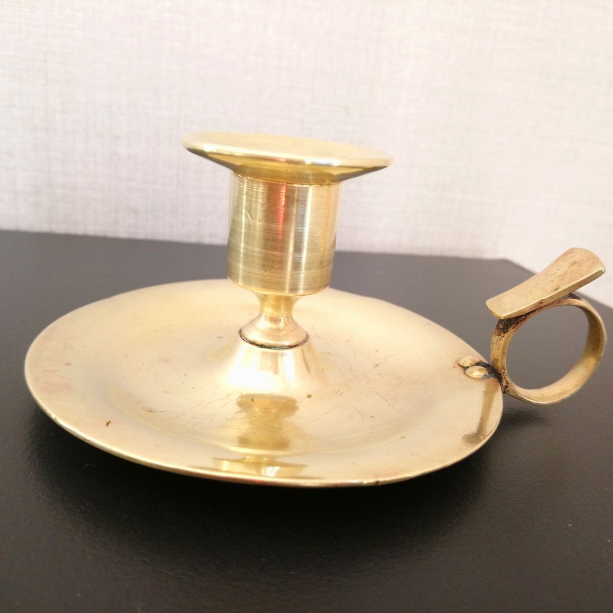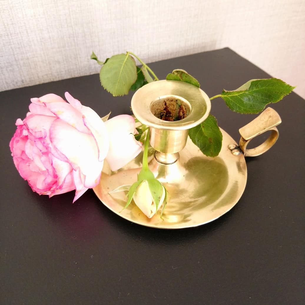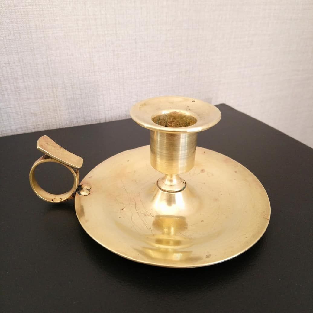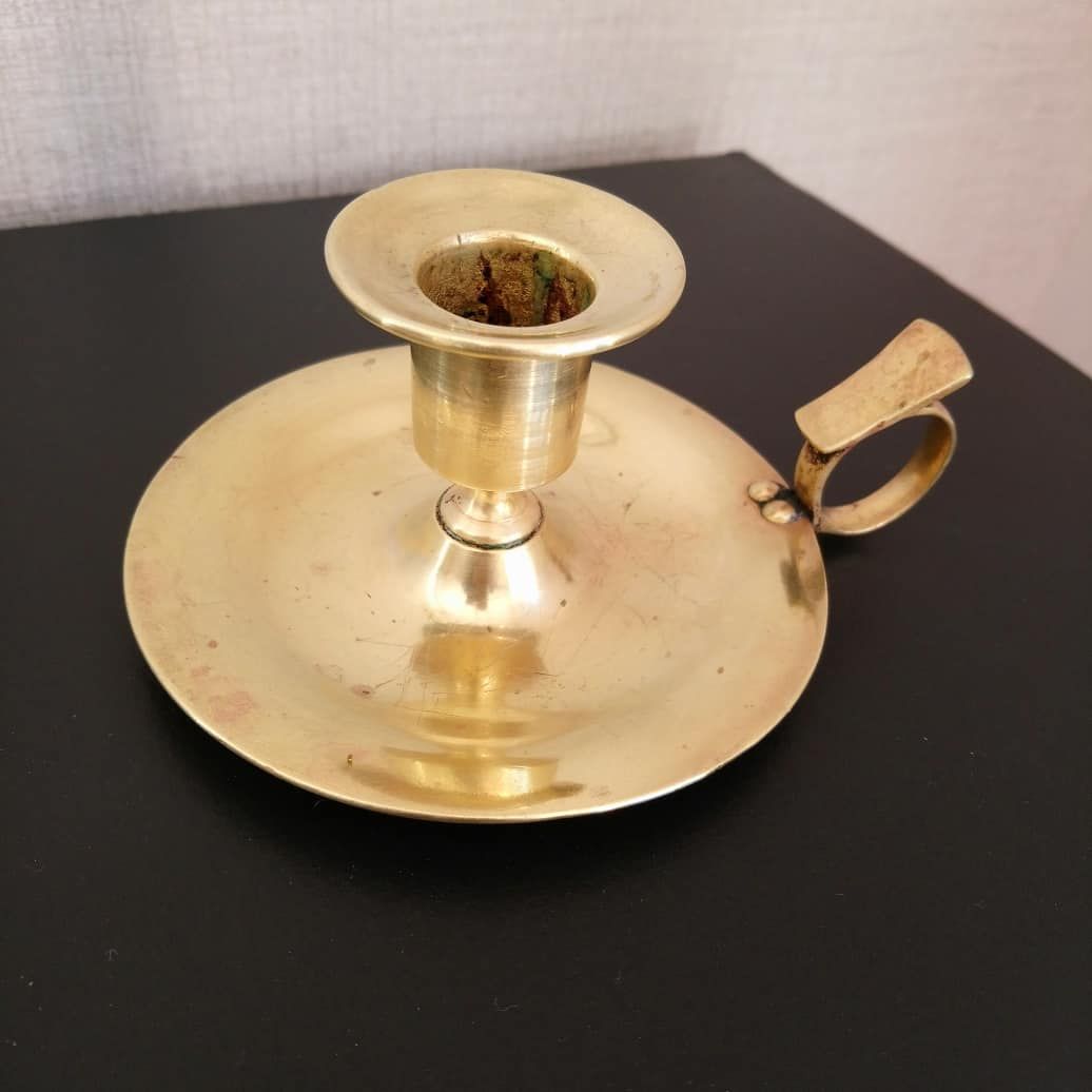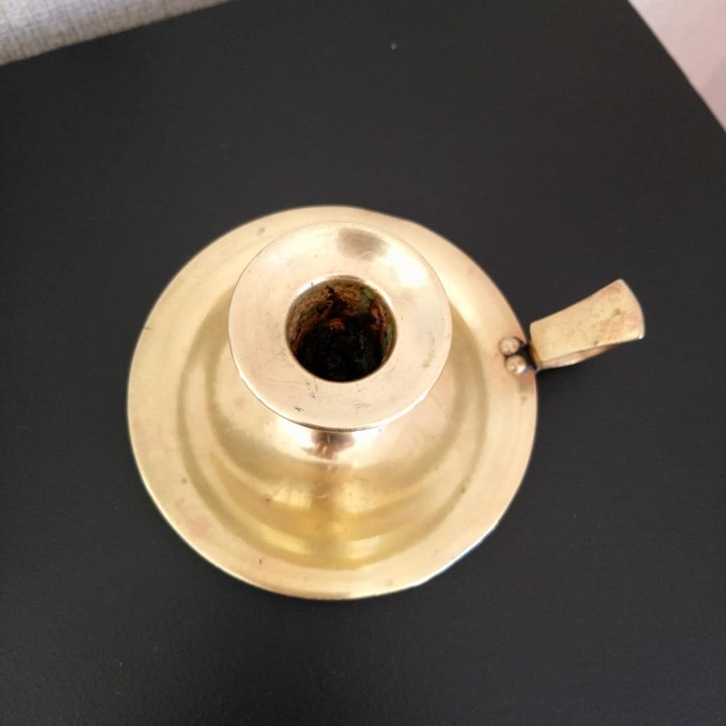 Bougeoir vintage en laiton poli pour lui redonner sa brillance. Quelques rayures mais discrètes.