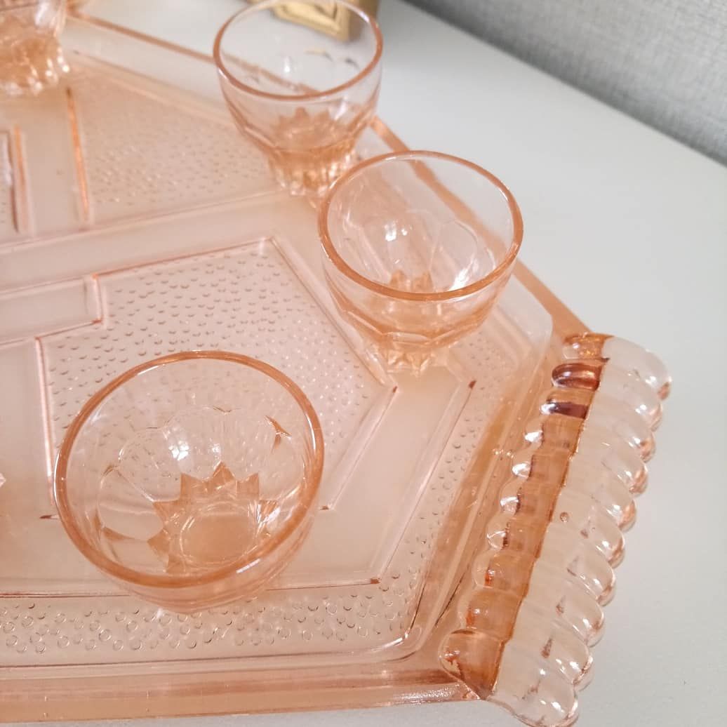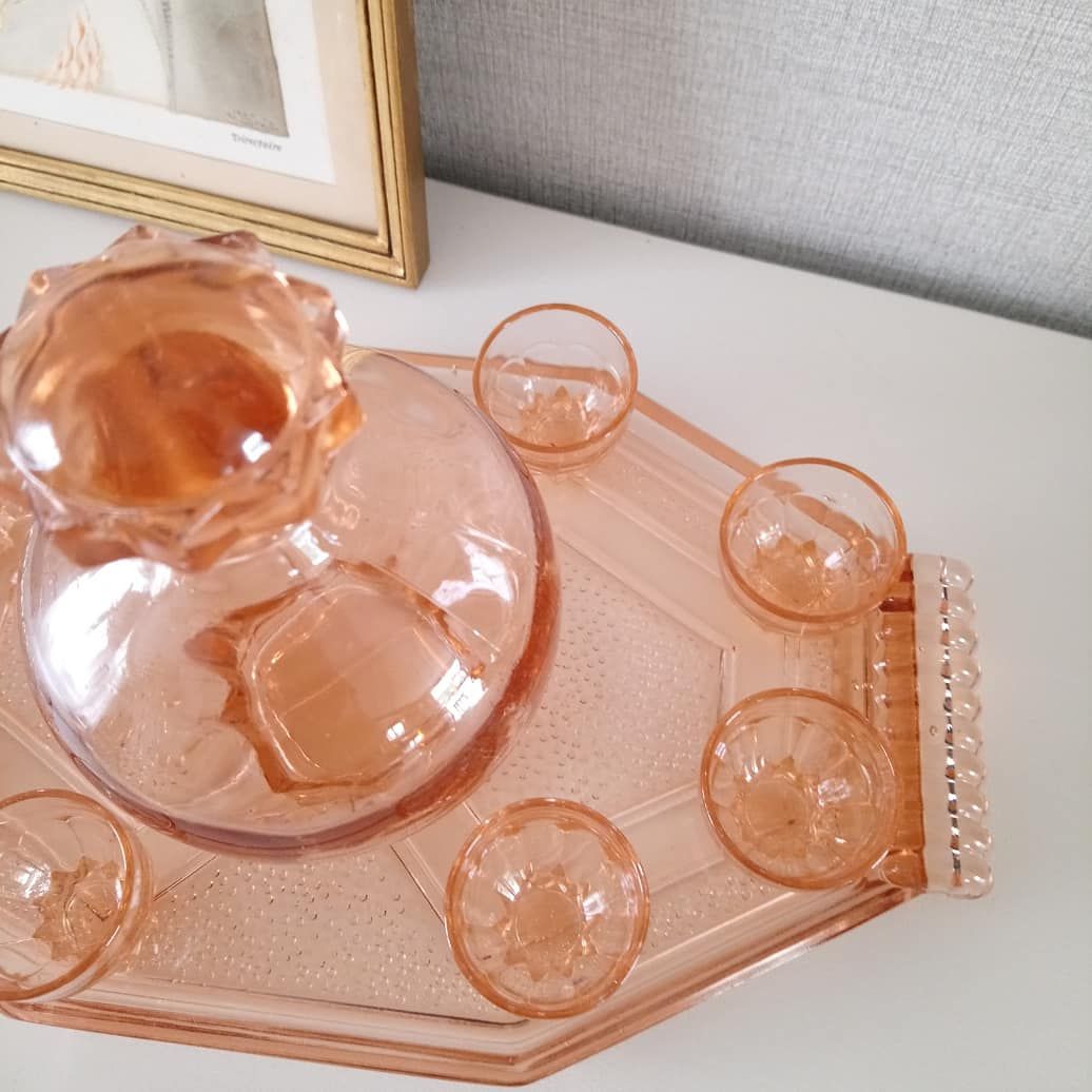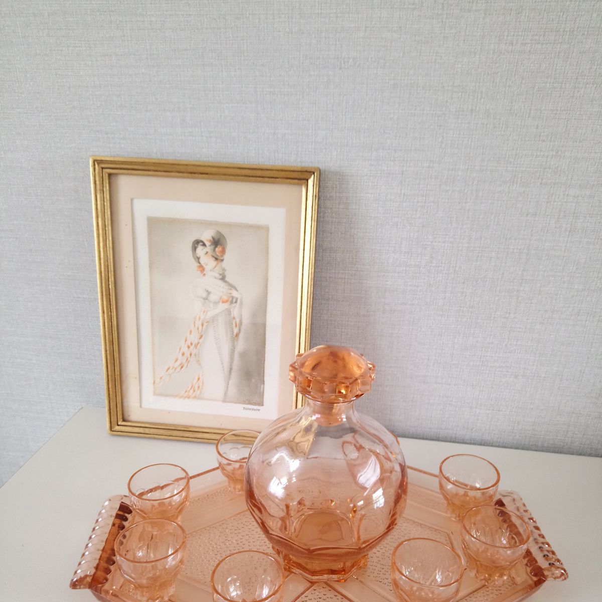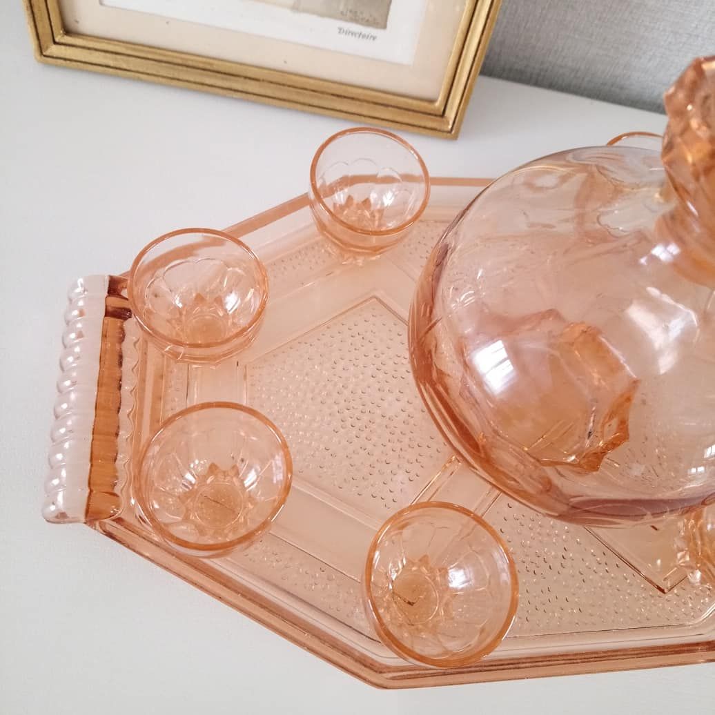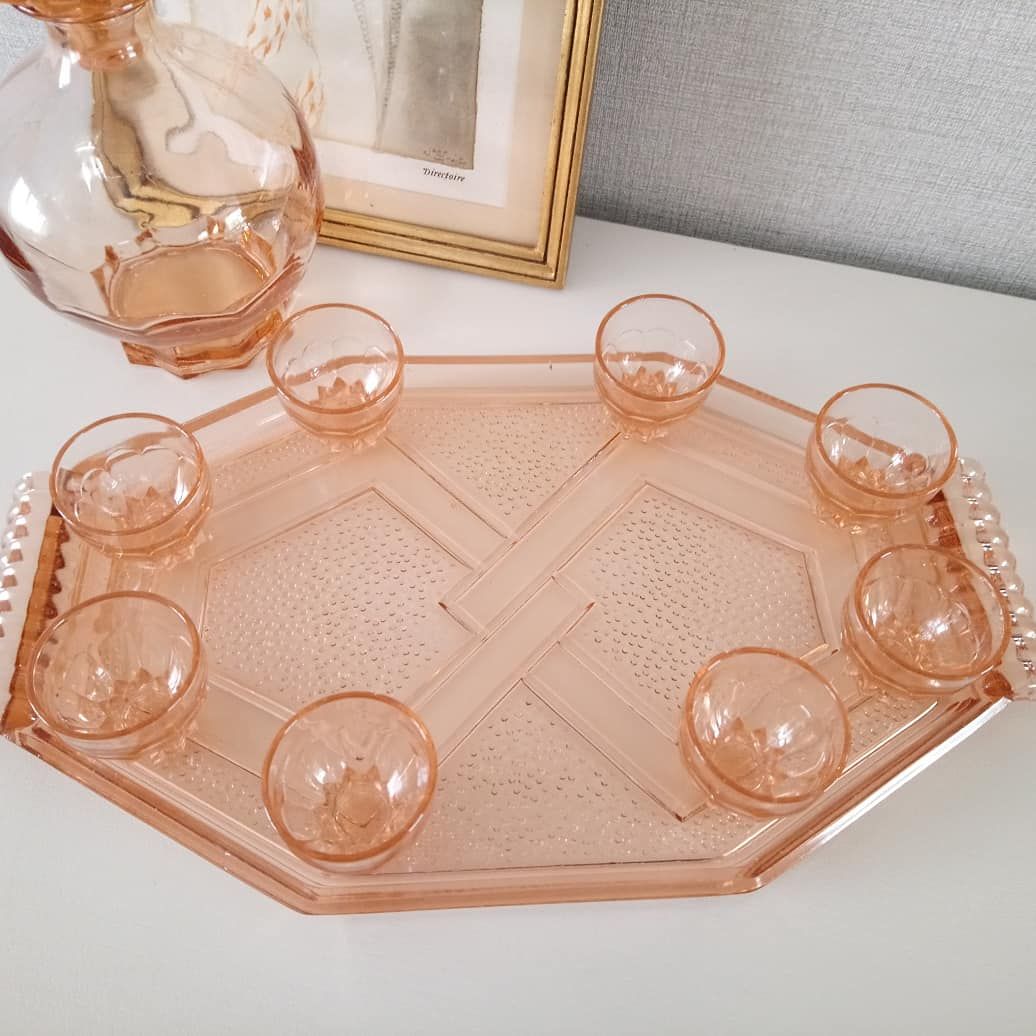 Service composé d une carafe, d un joli plateau style art déco, et de 8 petits verres.