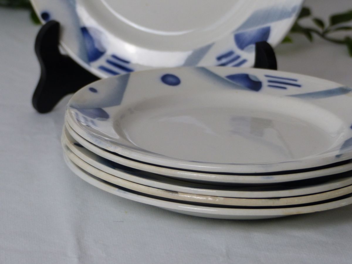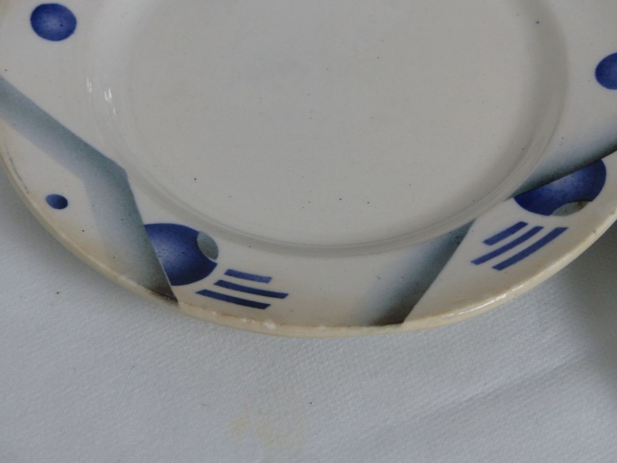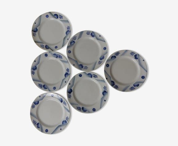 6 assiettes à dessert en faïence non signées. Début Xxème, très beau décor art-déco avec deux tons de bleu. Quelques éclats et traces d'usage qui n'enlèvent rien au charme de cet ensemble au look rétro. Diamètre 18,3 cm.