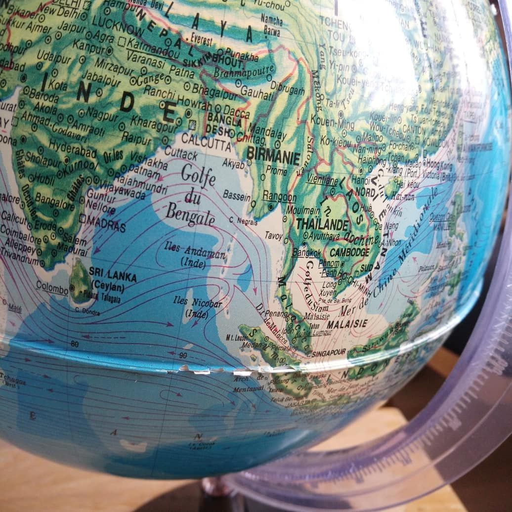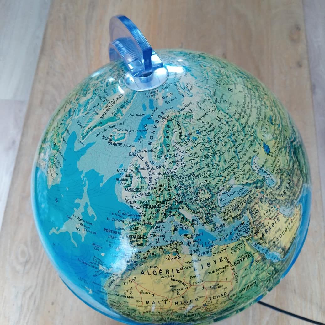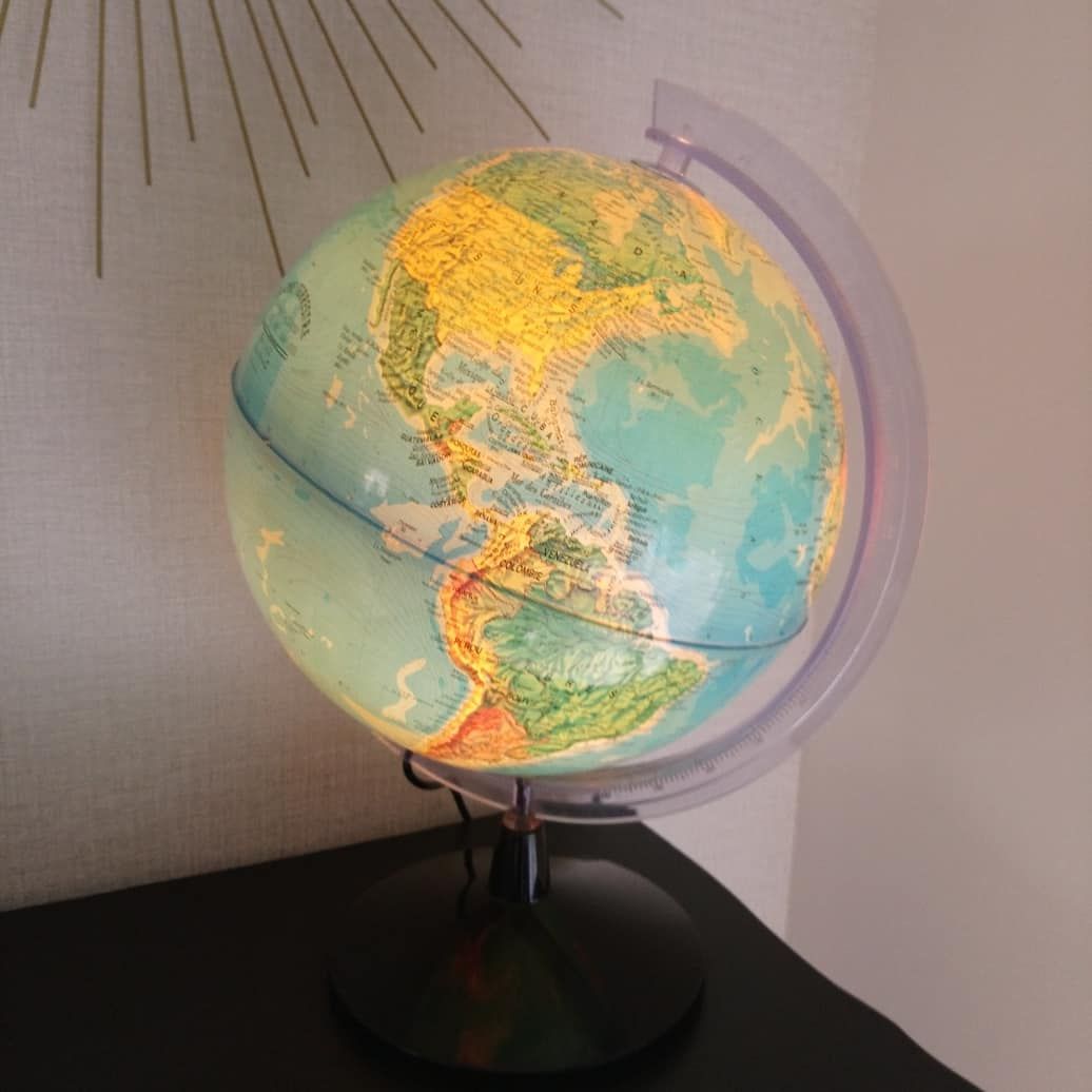 Joli globe terrestre vintage, globe en plastique, petit éclat discret (voir photo). Éclairage fonctionne.