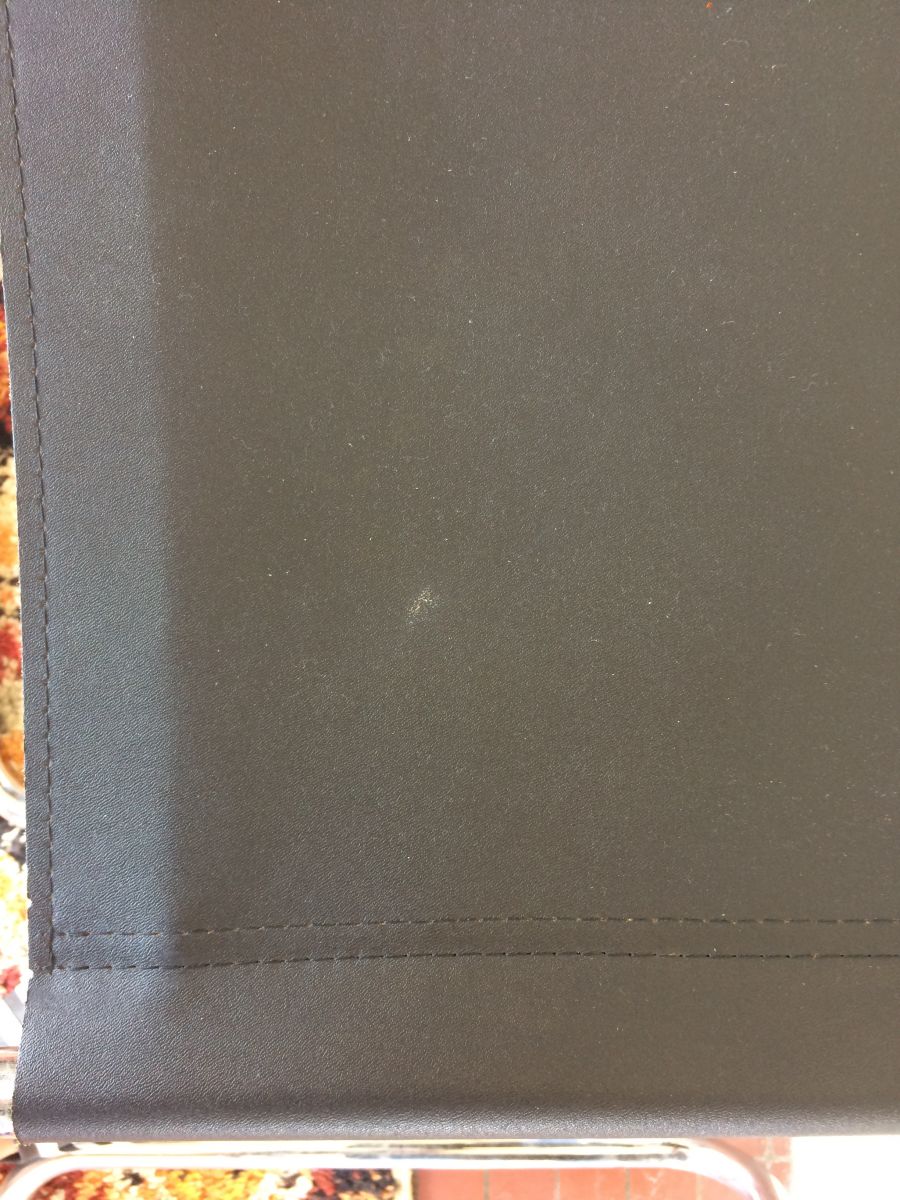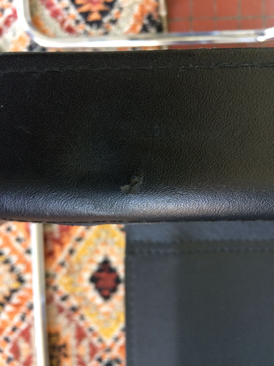 Deux petites zones de cuir abimées. La structure tubulaire des fauteuils est en bon état avec de légères marques d'oxydation.