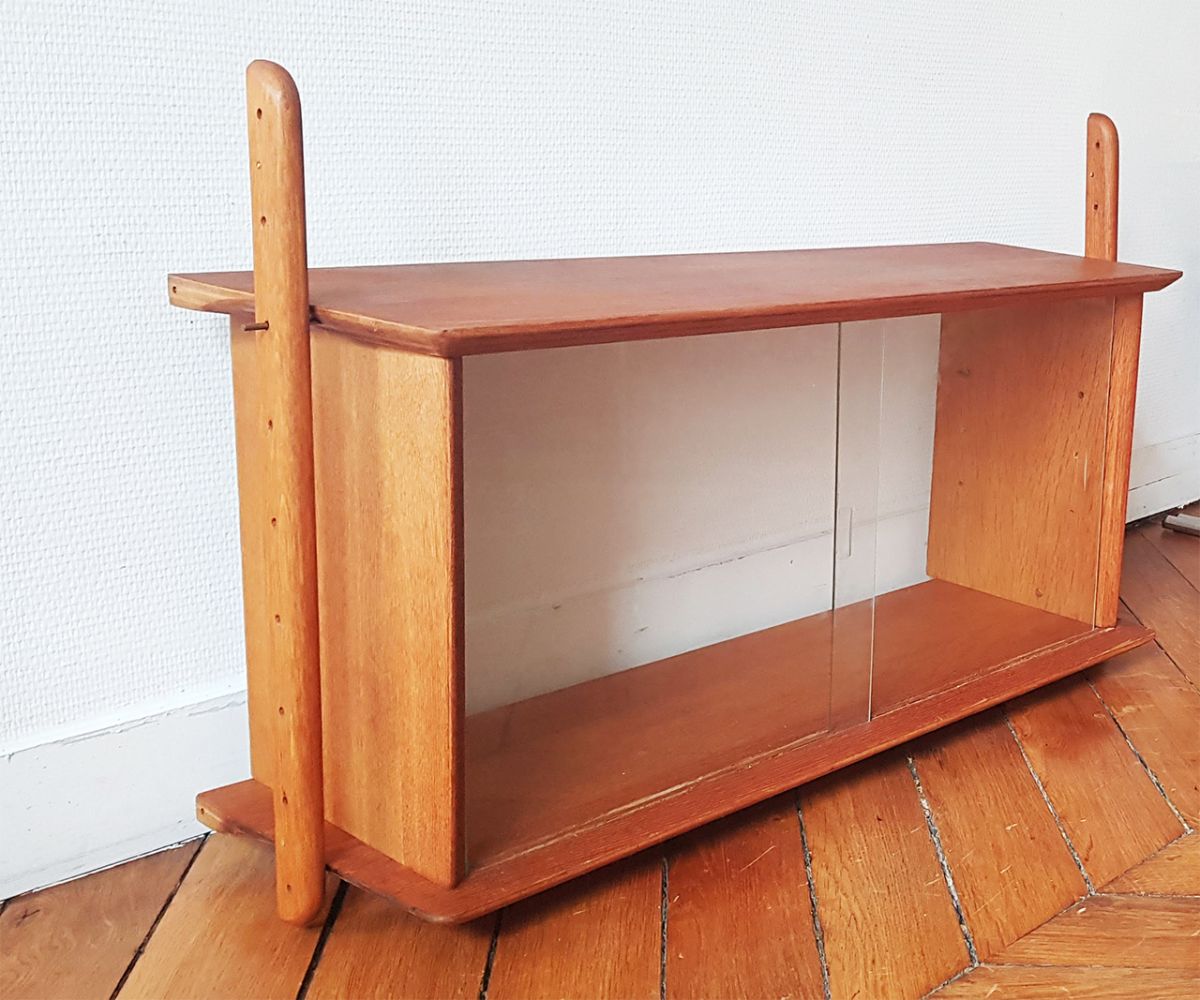 Très belle étagère murale vintage en bois. Mobilier authentique des années 60, en très bon état. Deux volets en verre viennent fermer l'étagère. Possibilité d'ajouter une tablette en verre également (fournie avec le meuble).