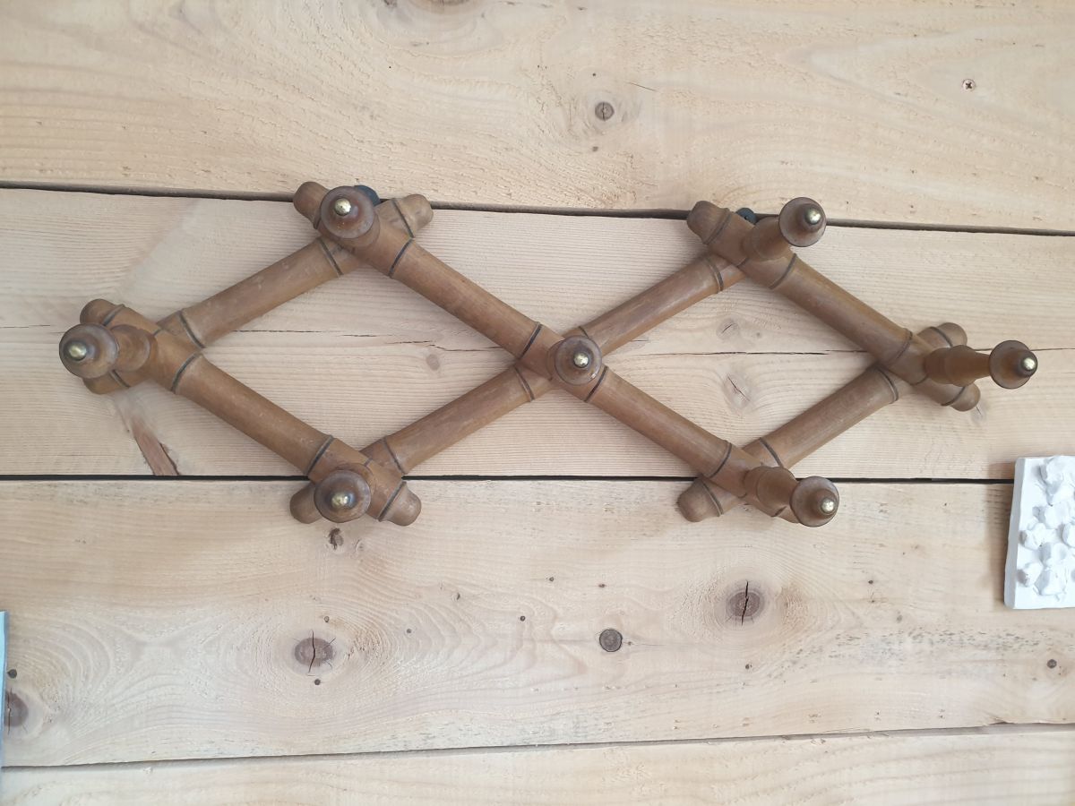 Ancien porte manteaux mural pliable en bois comprenant 7 patères avec embout laiton.