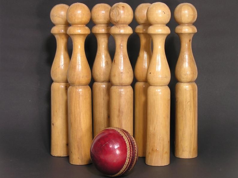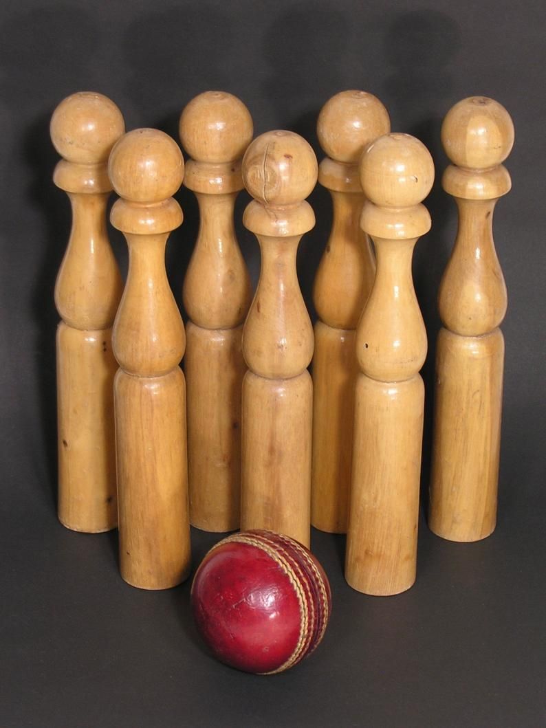 Jeu de bowling avec des quilles en bois vernies et une véritable balle de cricket en cuir