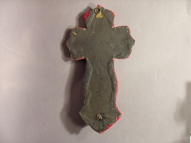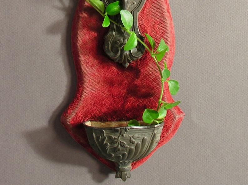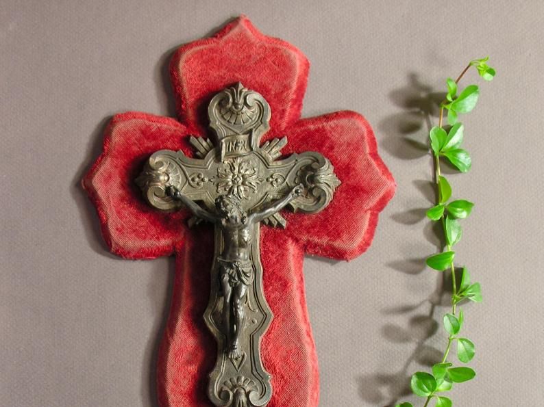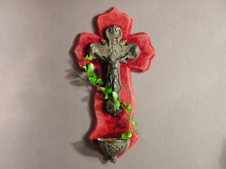 Christ en Croix sur Velours Rouge / Bénitier Mural Français