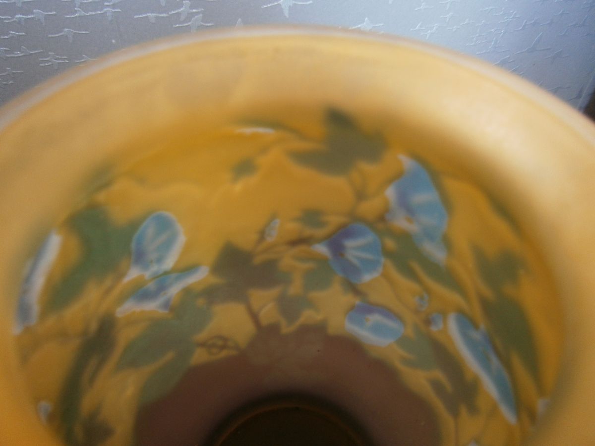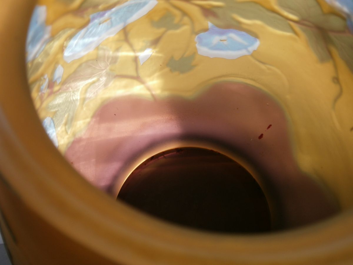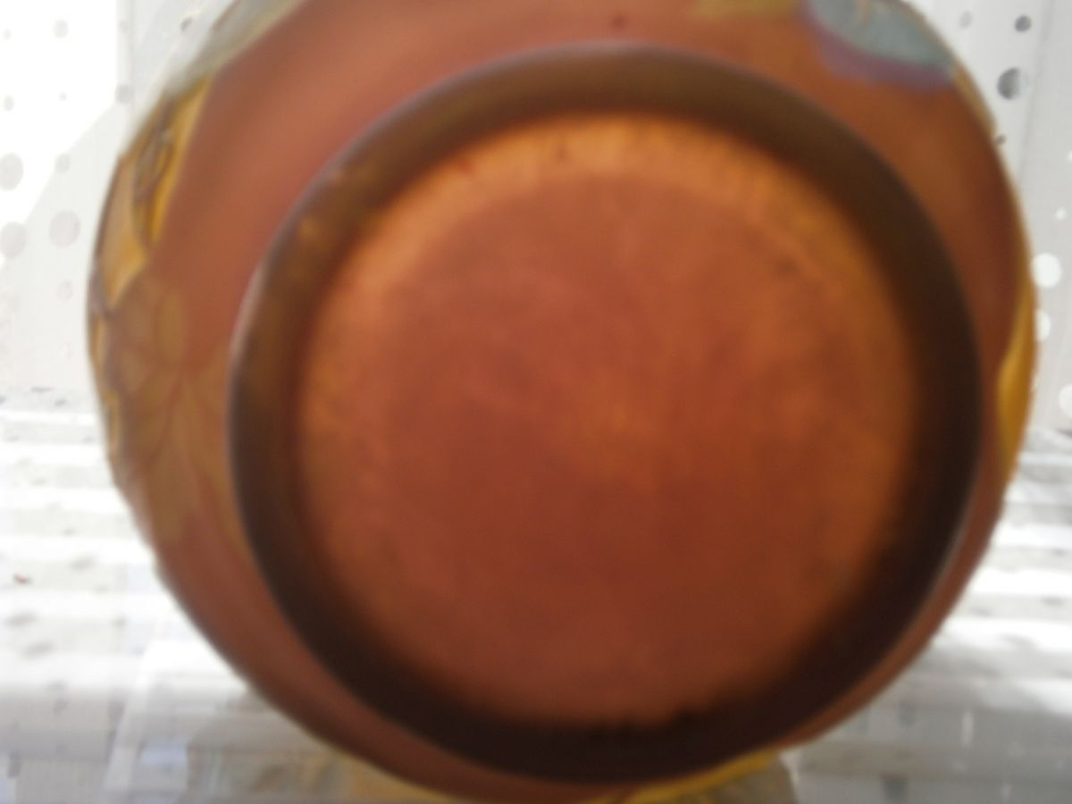 Ce très élégant vase , dégagé à l'acide , qui dévoile toute sa beauté en pleine lumière . Le fond du vase devient violet .