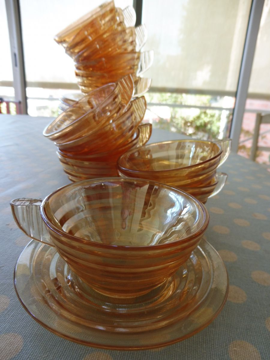 Service 12 tasses/soucoupes café rose orangé irisé Gondolo
