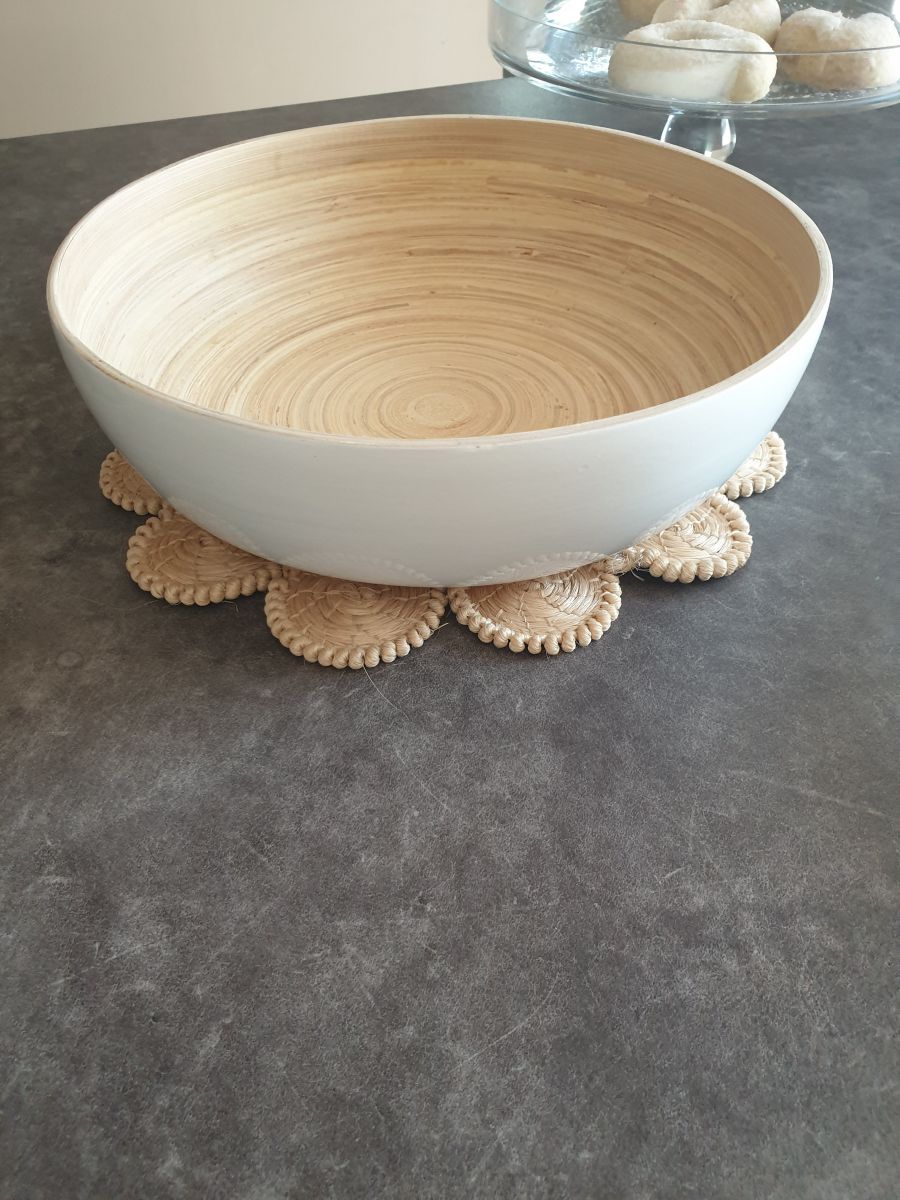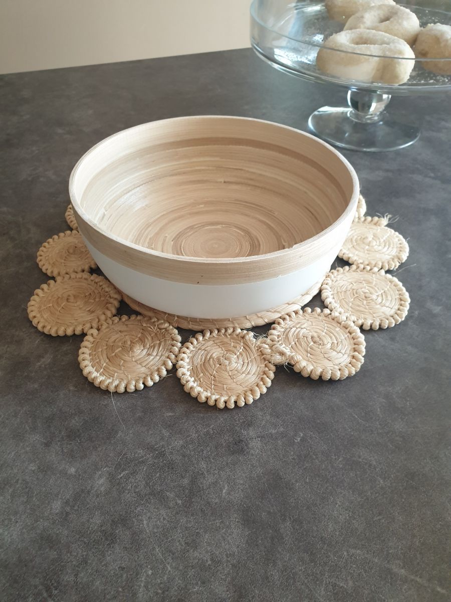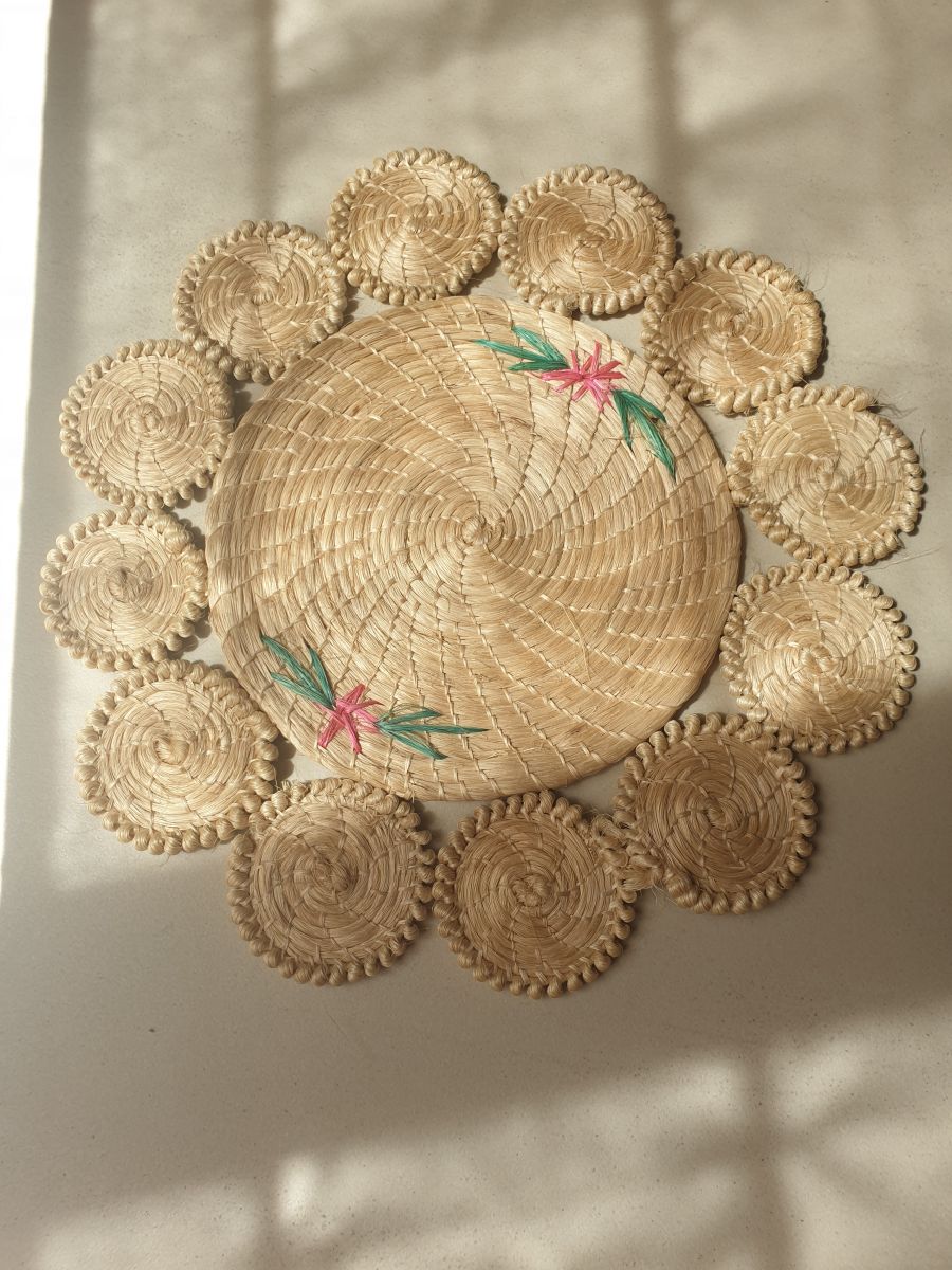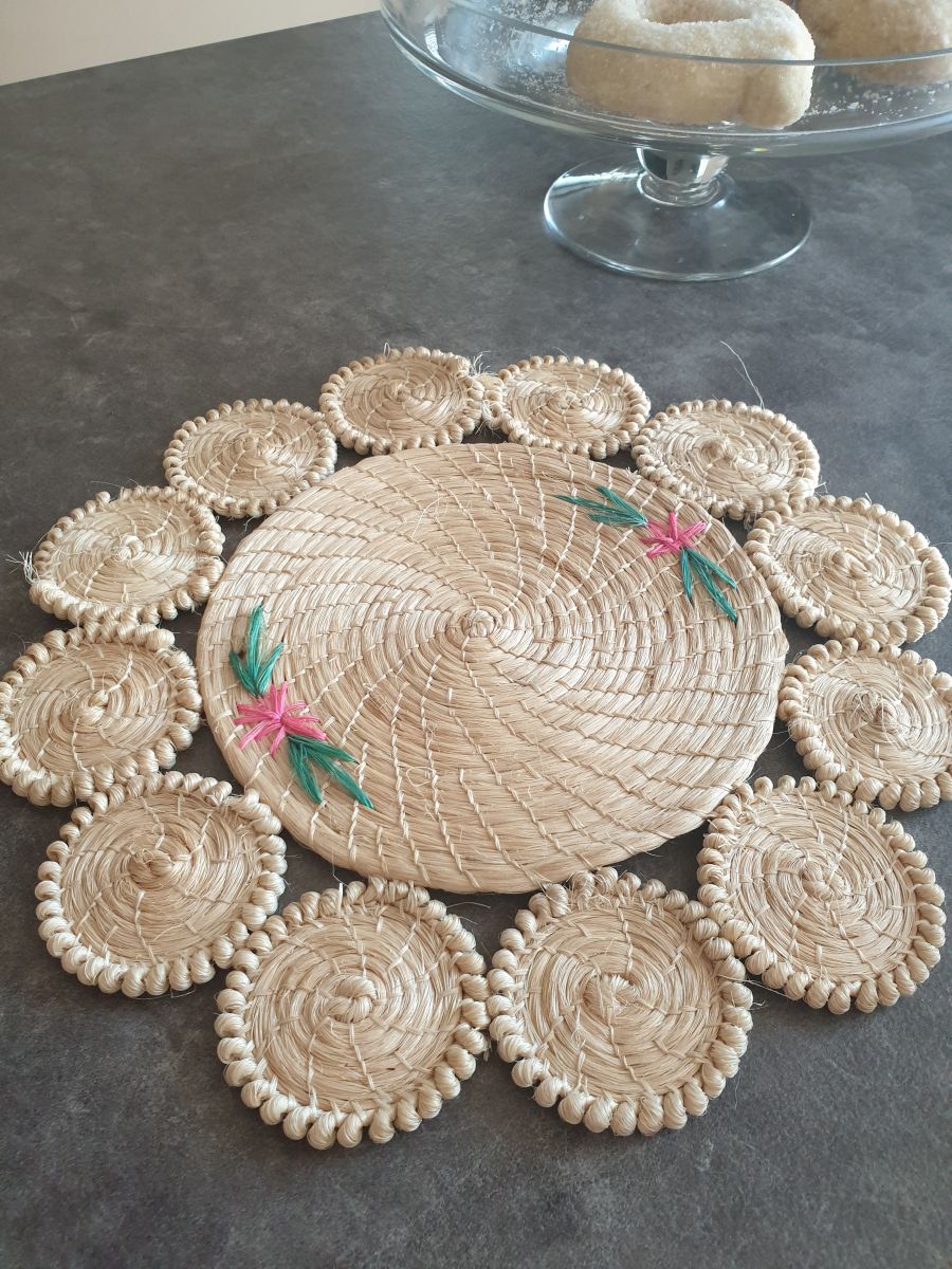 Joli et original dessous de plat en rafia avec deux motifs fleurs.