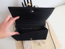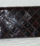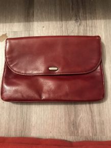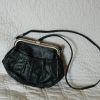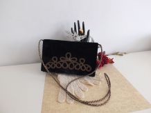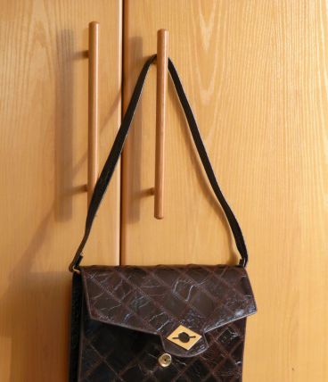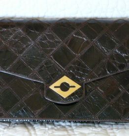 Petit sac à main pochette avec bandoulière amovible. Extérieur cuir patchwork croco. Forme enveloppe avec fermoir doré losange pression.