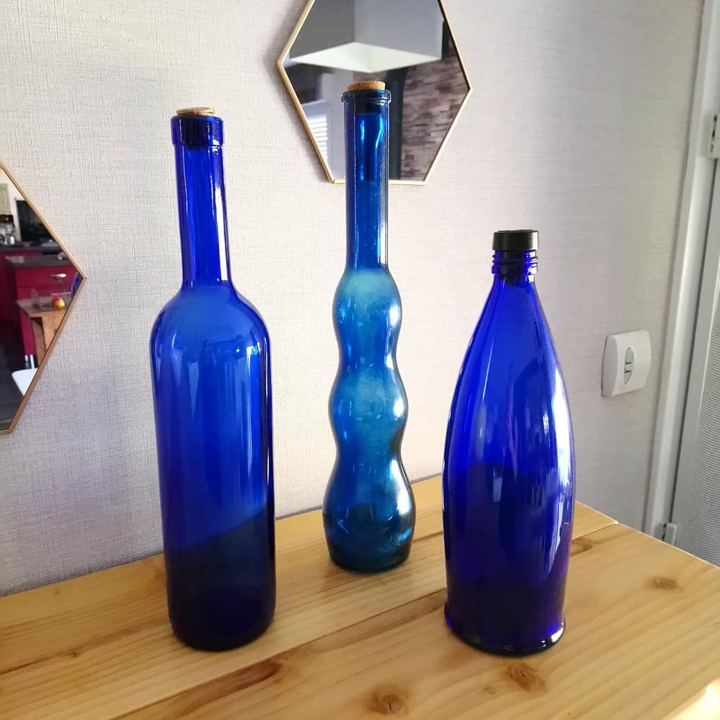 Trio de bouteilles bleues.