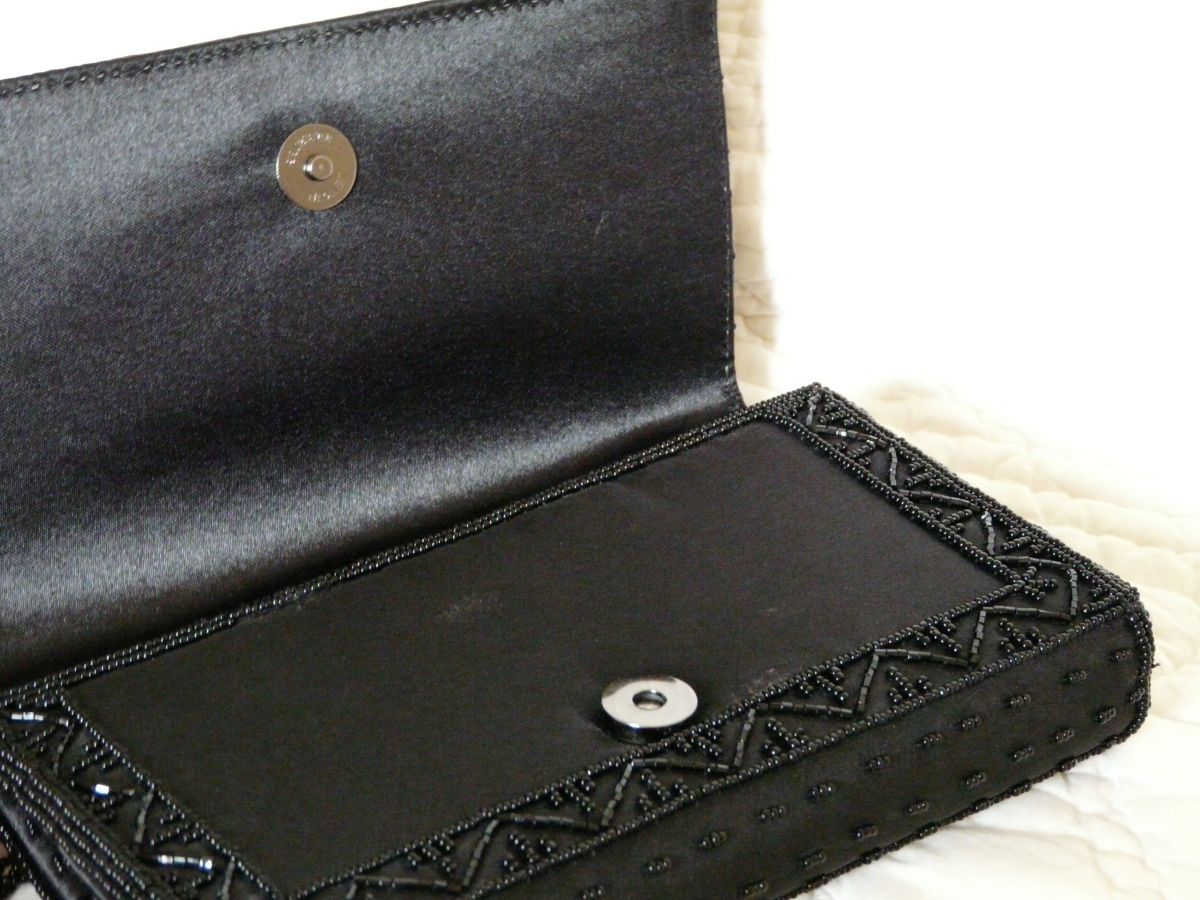 Pochette soirée noire en satin avec rabat et pression aimant, décoré fines perles noires.