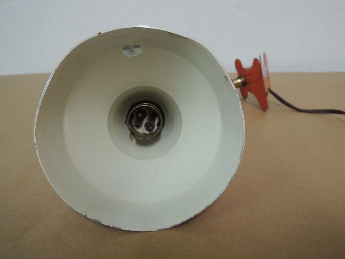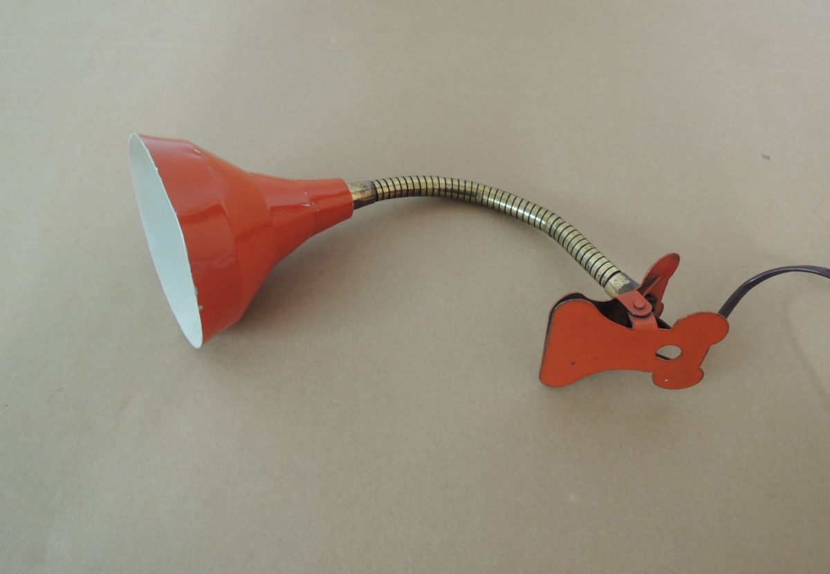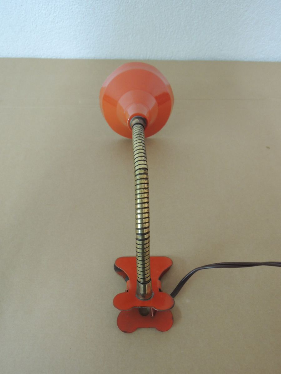 Petite lampe cocotte à pince, année 60, orange, flexible doré, avec interrupteur, douille B22 à baïonnette, électricité contrôlée, traces d'usure et d'usage. L30cm