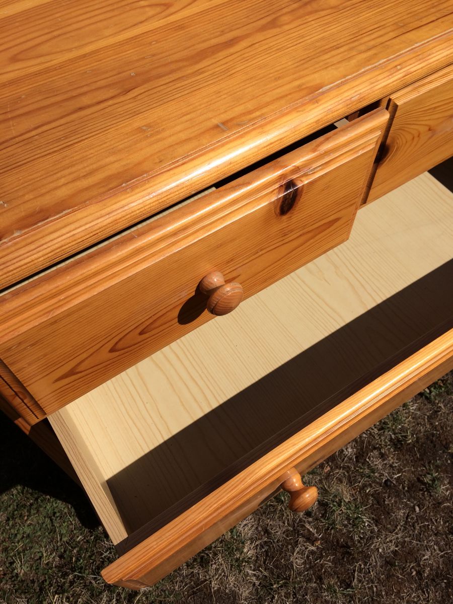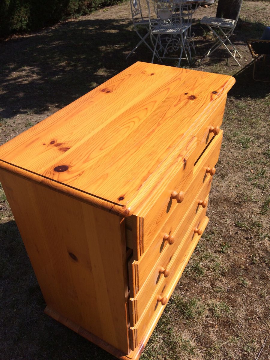 Commode en pin massif état moyen car quelques éraflures sur le dessus et sur un tiroir mais en très bon état concernant l intérieur des tiroirs.les dimensions sont 80 cm de hauteur ,80 cm de longueur et 40 cm de largeur .