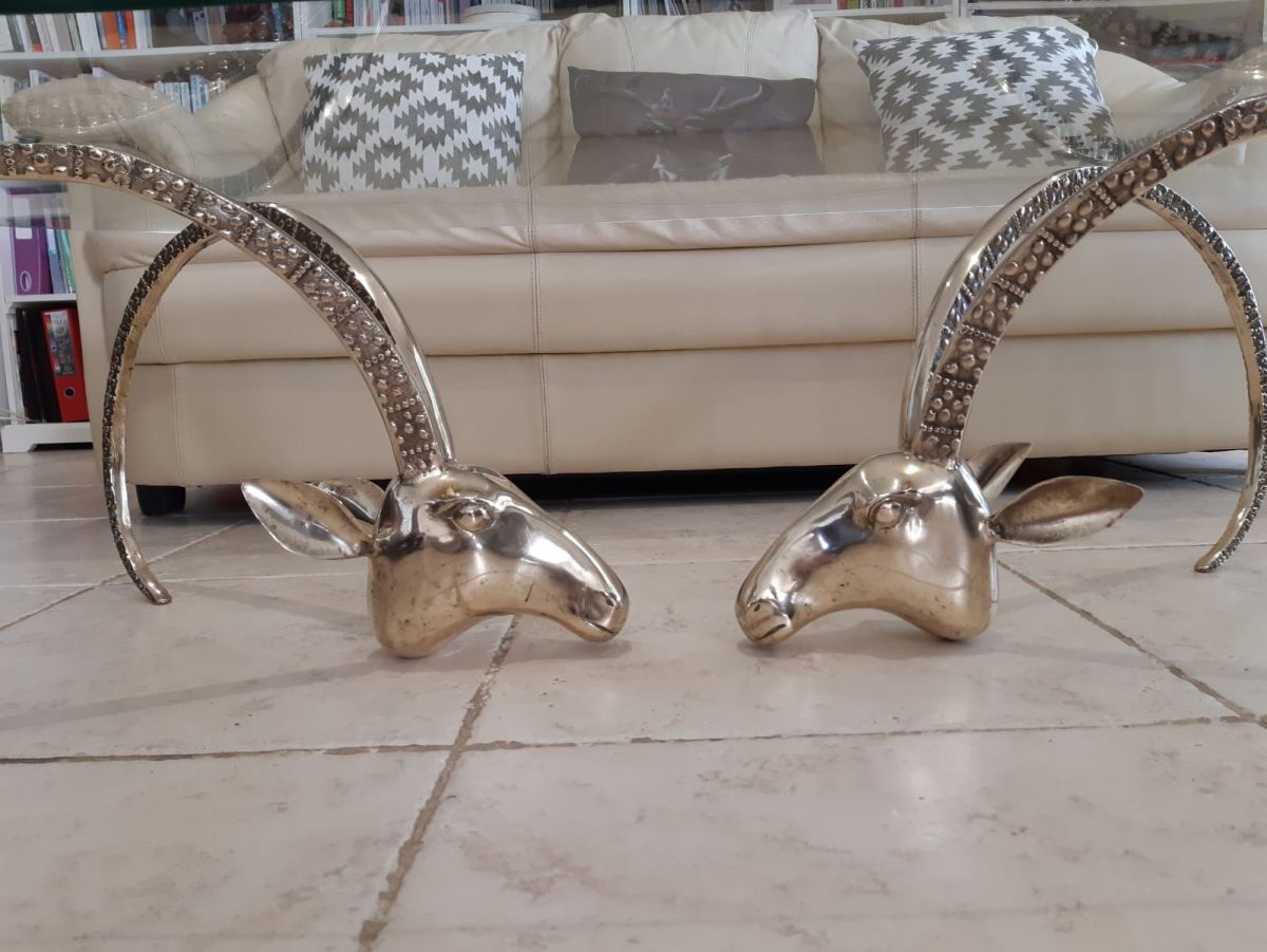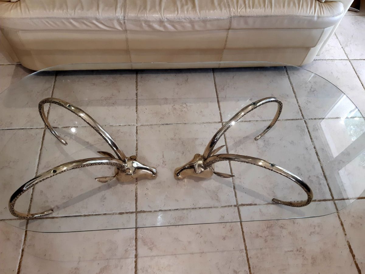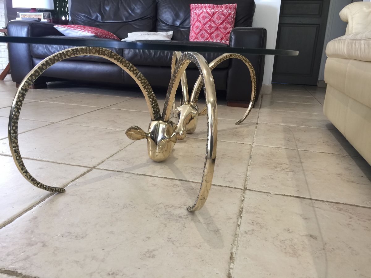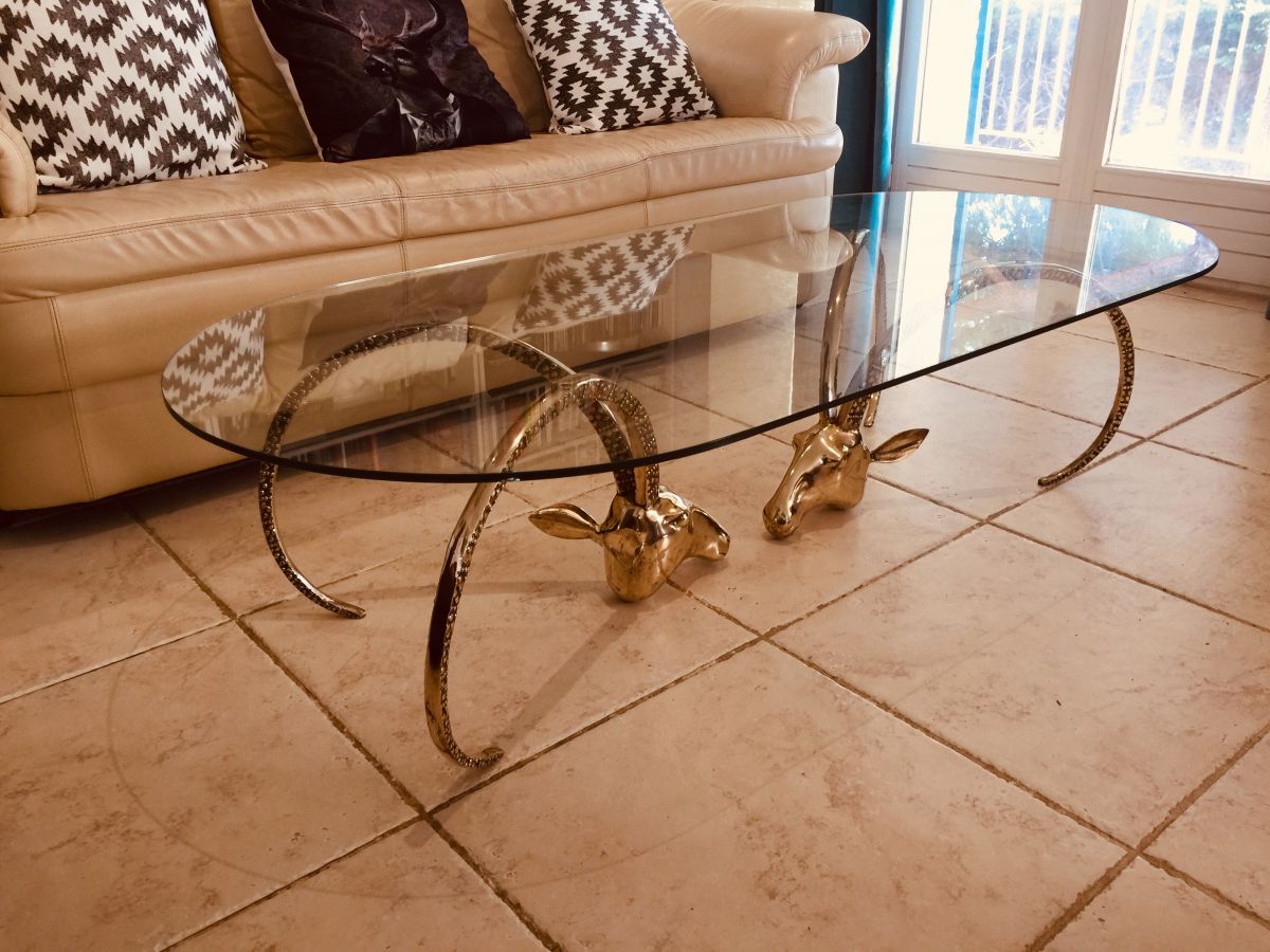 Table basse vintage années 70 avec 2 têtes de bélier en laiton doré.