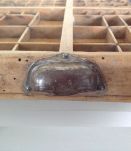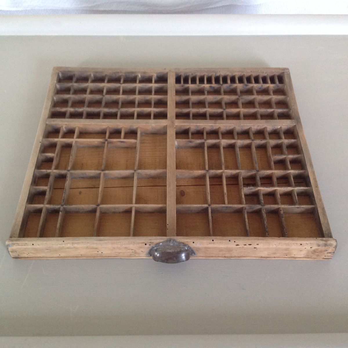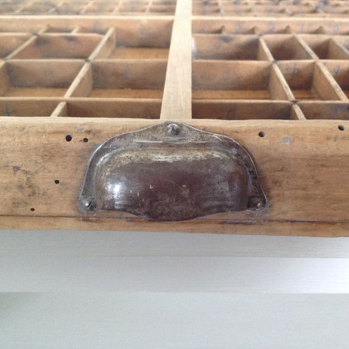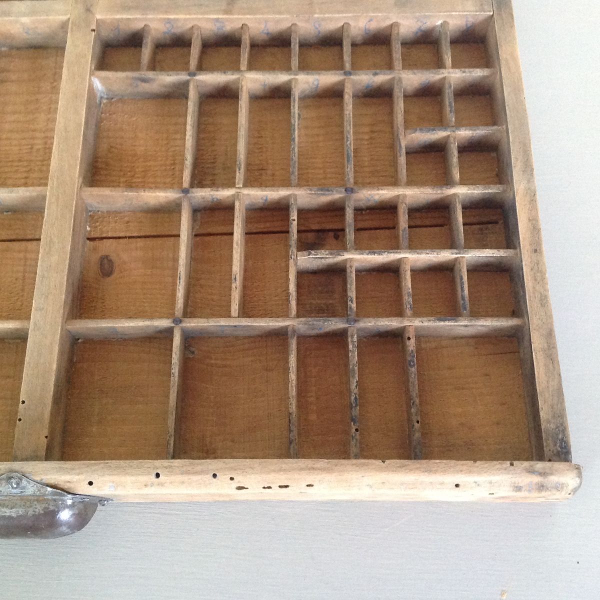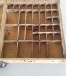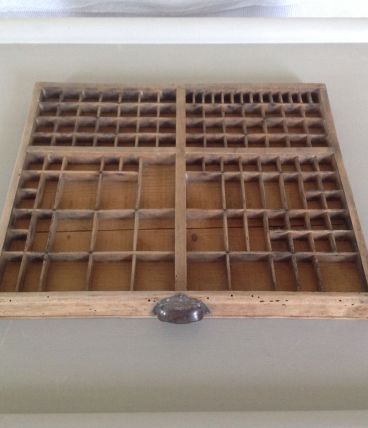 De nombreuses petites cases, une jolie poignée en fer , et voilà un casier d'imprimeur , tout en bois , idéal pour ranger ses accessoires de mercerie ou exposer ses miniatures.