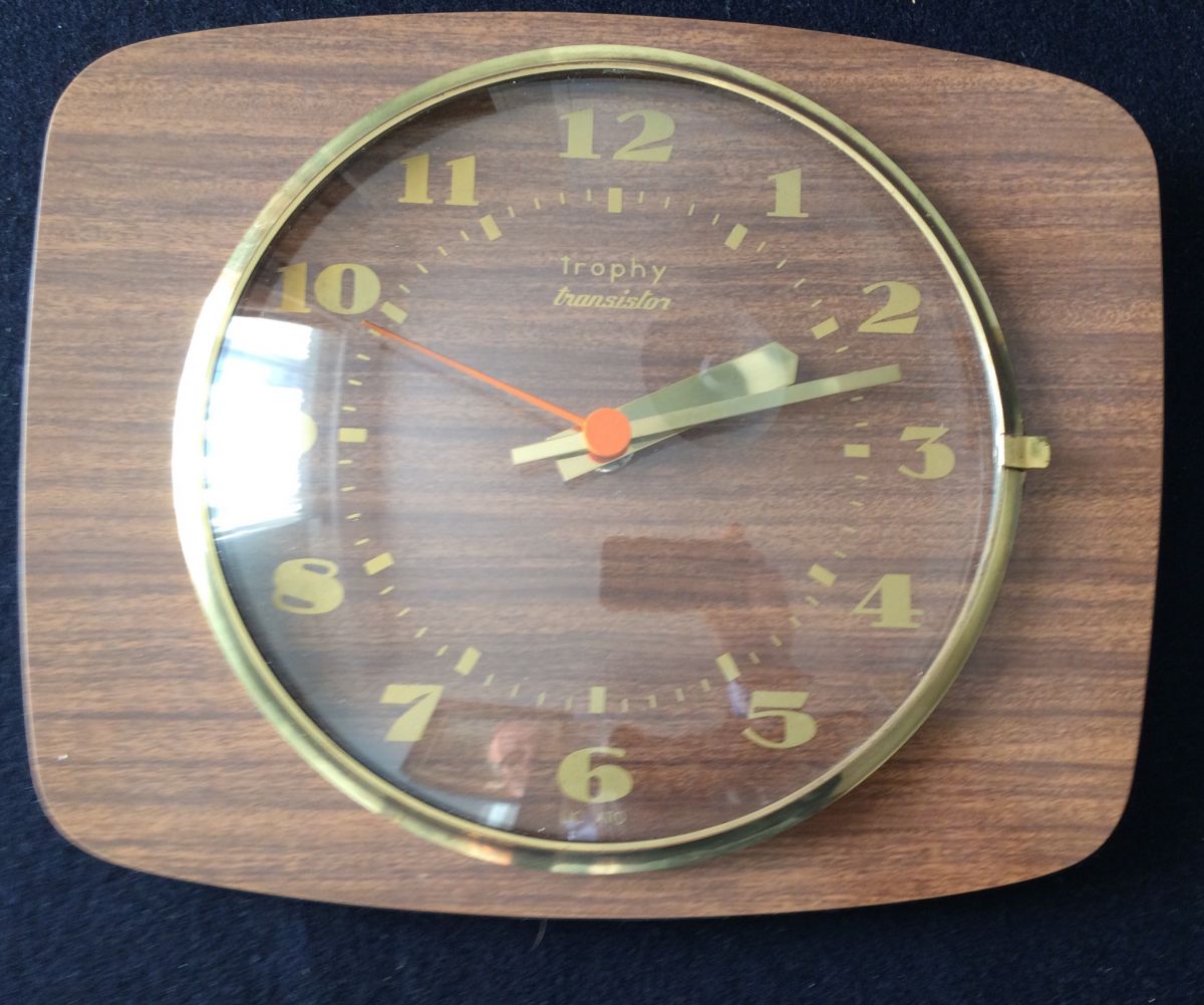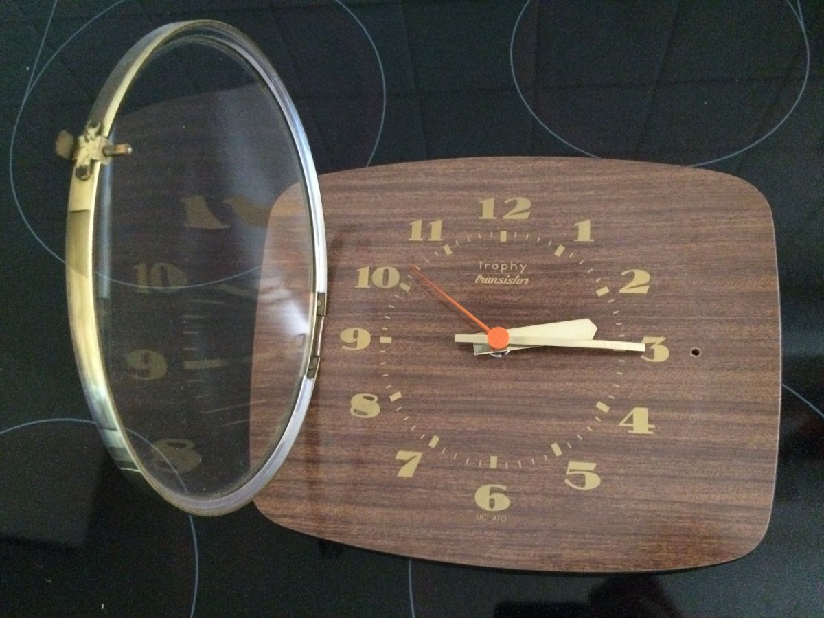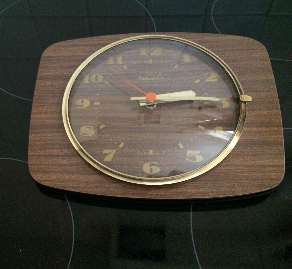 Pendule de cuisine vintage en FORMICA couleur noyer imitation bois, typique du design de 1960.