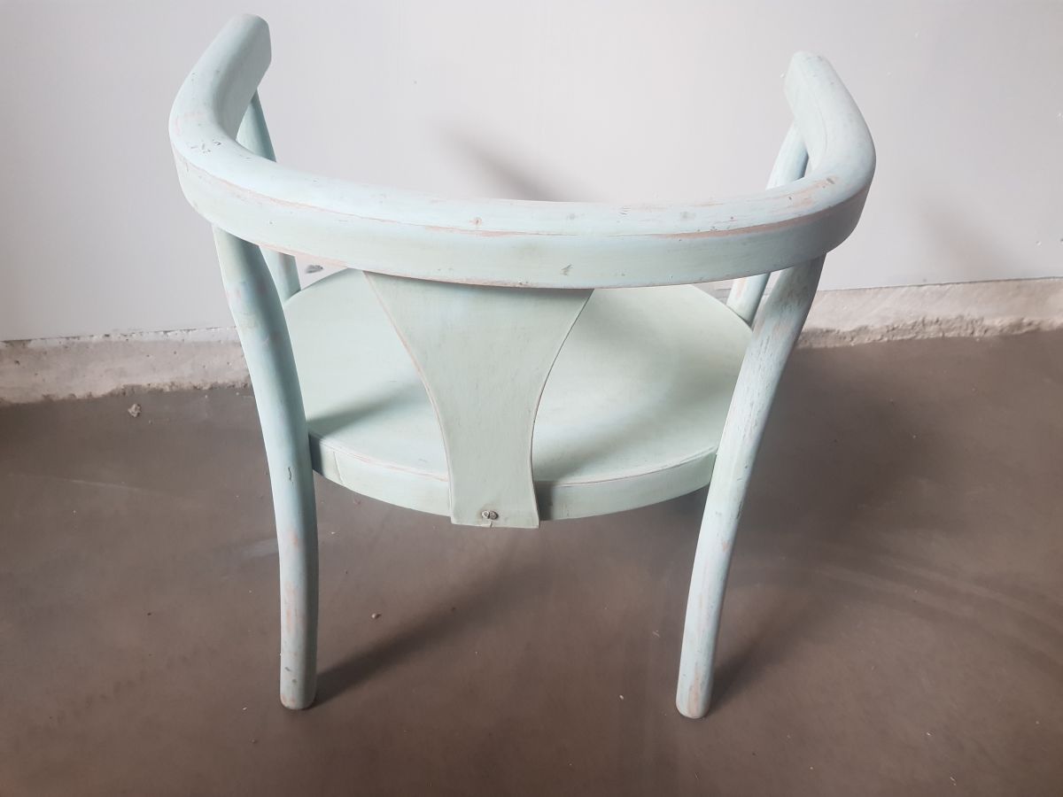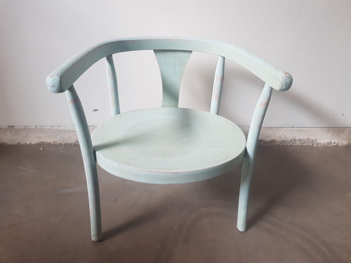 Ce joli fauteuil Baumann des années 50 trouvera sa place dans une chambre d'enfant ou un salon. Il s'agit du modèle n°392 du fabricant, il est dans son jus, de couleur vert d'eau poncé en partie ce qui lui donne un aspect authentique et vieilli naturellement. Il peut être repeint ou rester en l'état. H39cm/L40cm/P30cm.