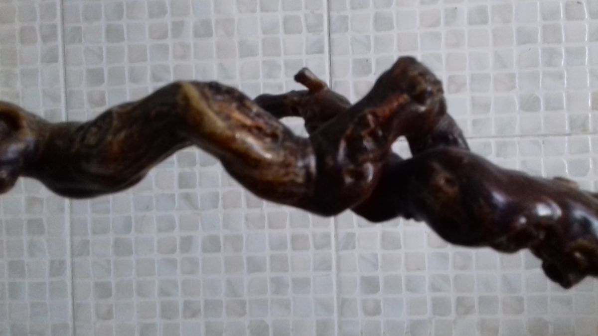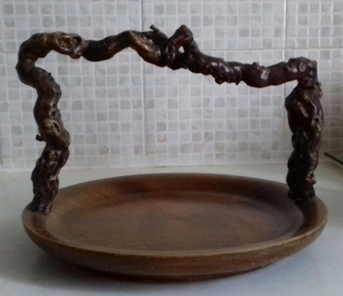Plateau rond en bois. Poignée en cep de vigne. Tir bouchon offert avec le plateau.