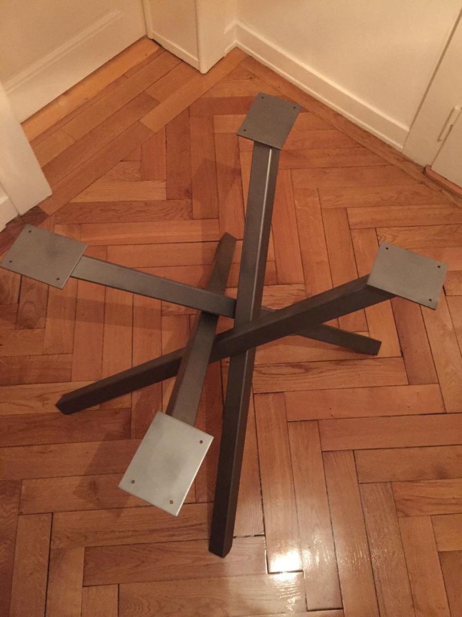- Piétement en métal type industriel composé de 4 sections carrées et soudées d'un seul tenant.