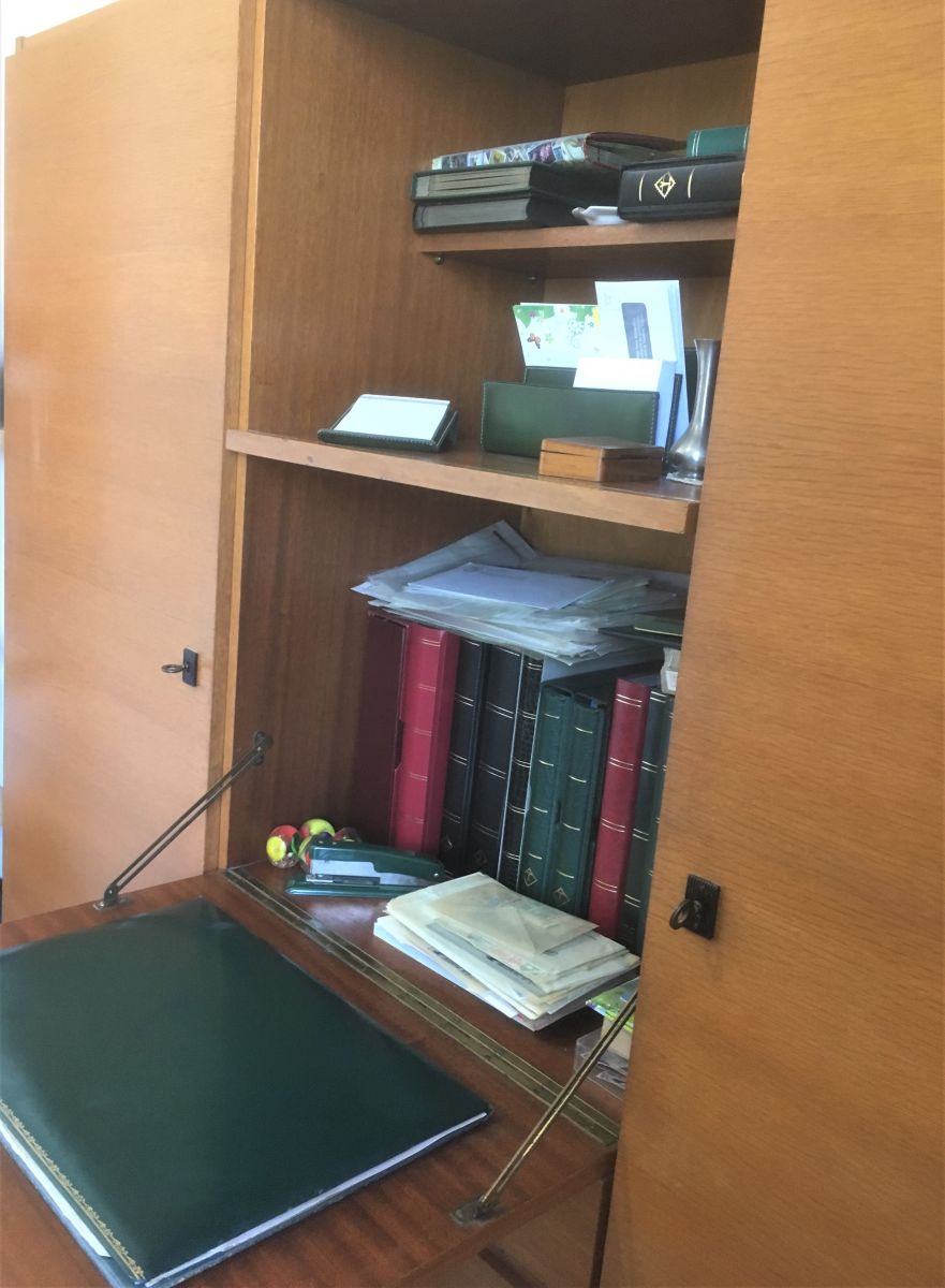 Au milieu secrétaire à abattant avec étagère bibliothèque au dessus