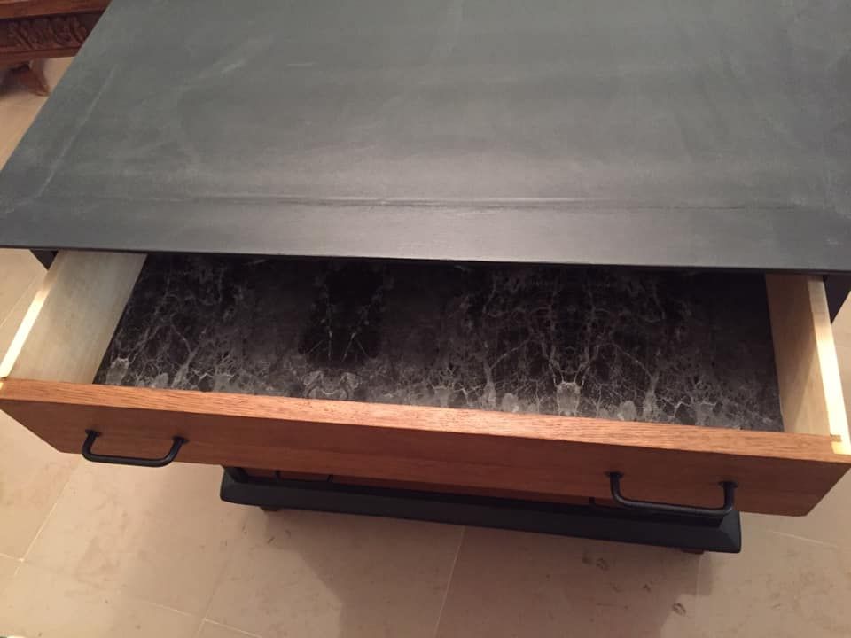Parfait état, bois massif, relookée en gris anthracite à l’extérieur, vernis sur les tiroirs.