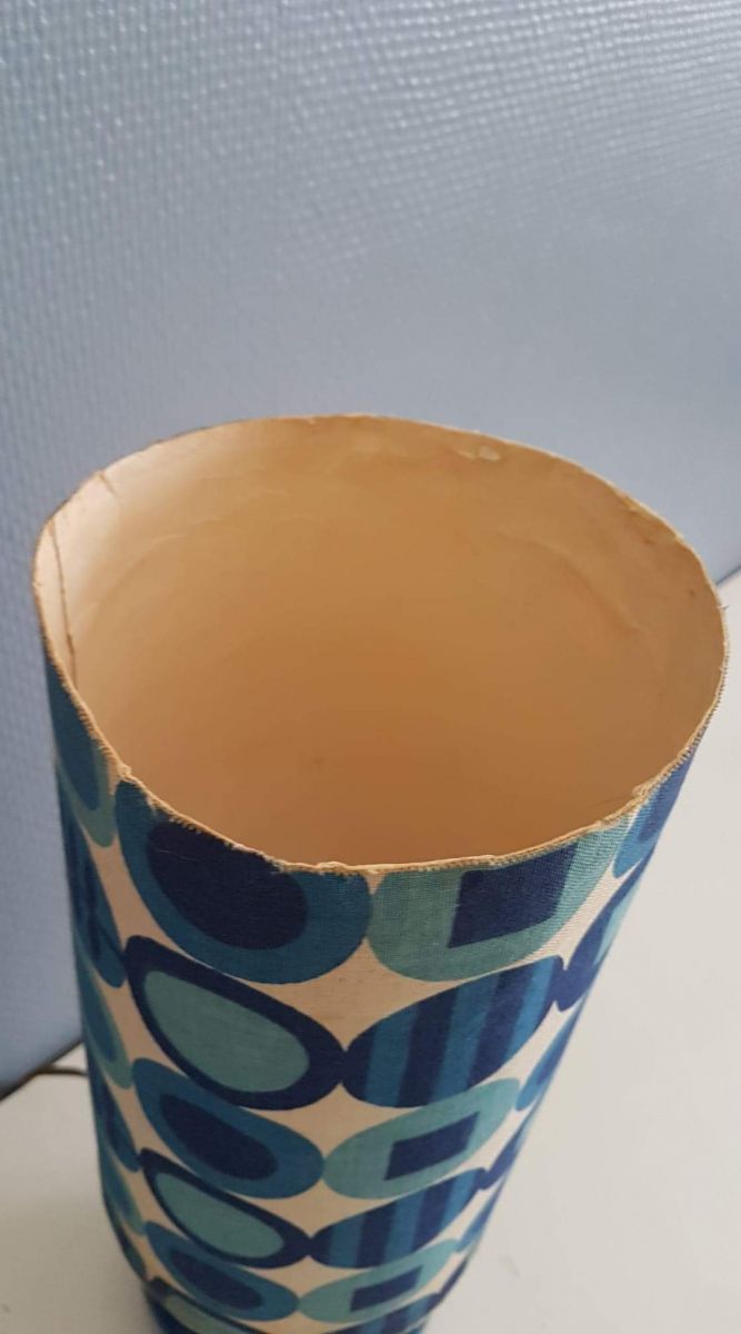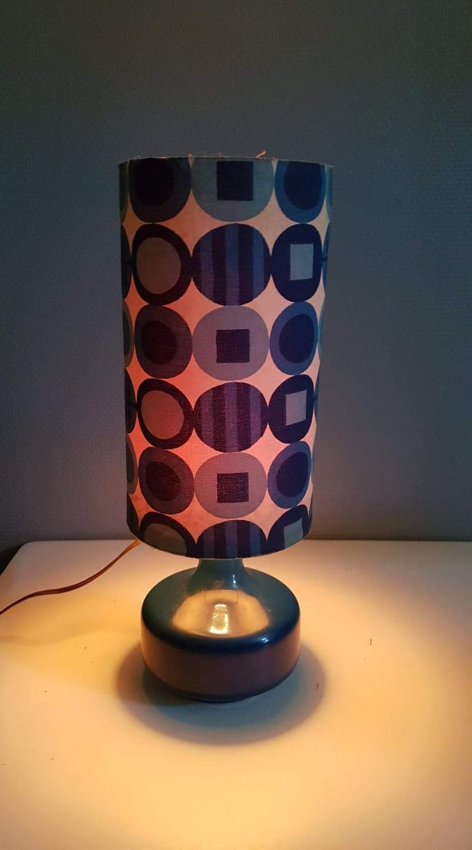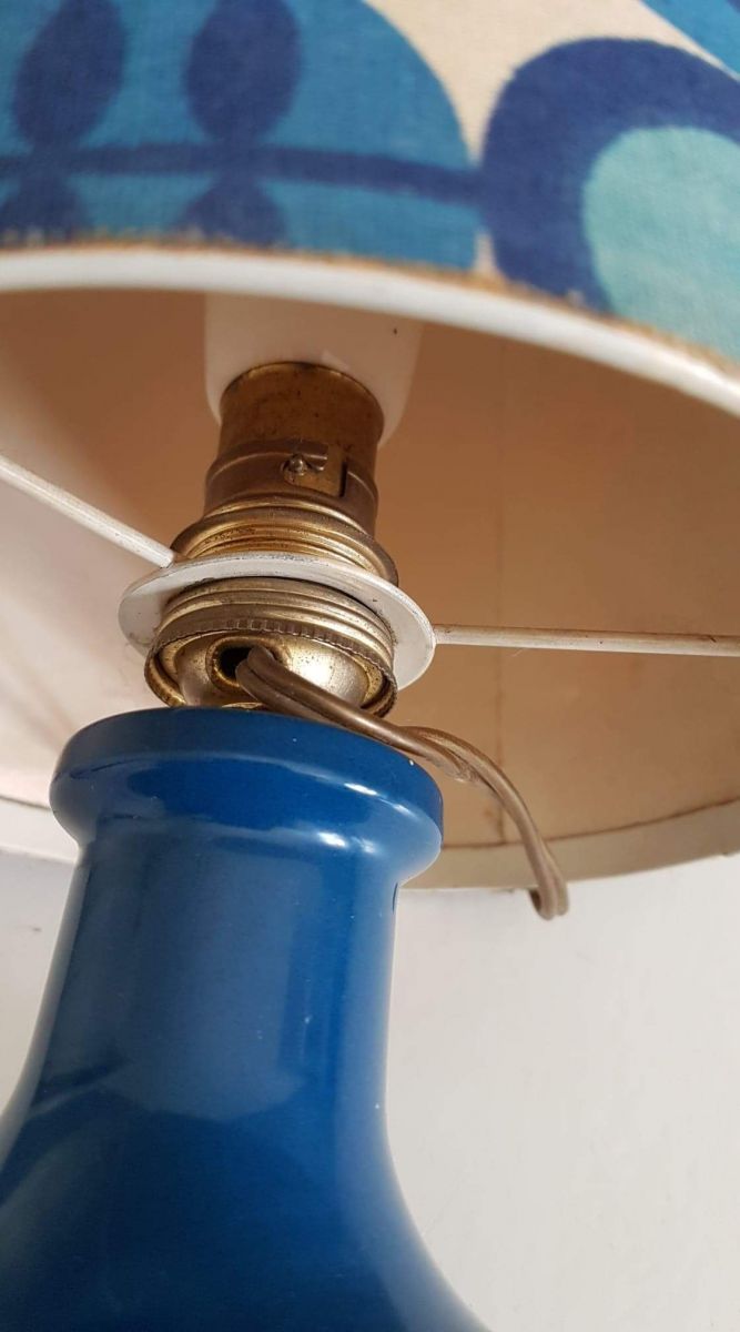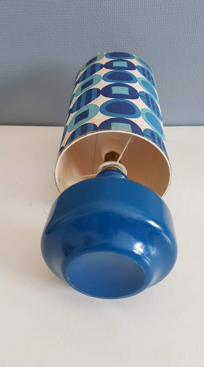 lampe à poser vintage pied céramique abat-jour tissu cartonné à fleurs bleues des années 70
