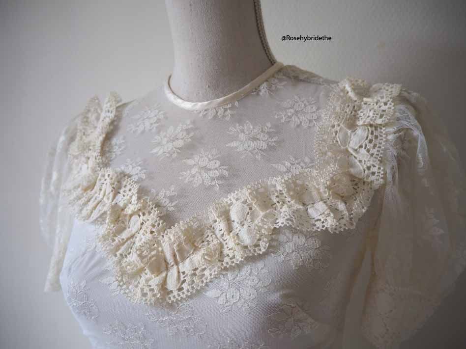 Col ras du cou avec un plastron en transparence, très joli ! Galon en broderie macramé sur la poitrine.