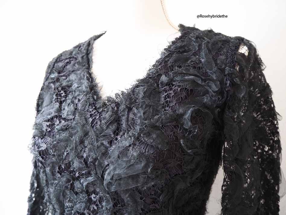 Très originale, totalement confectionnée en dentelle/résille et empiècement en tulle façon froufrous. Fine doublure intérieure satinée.