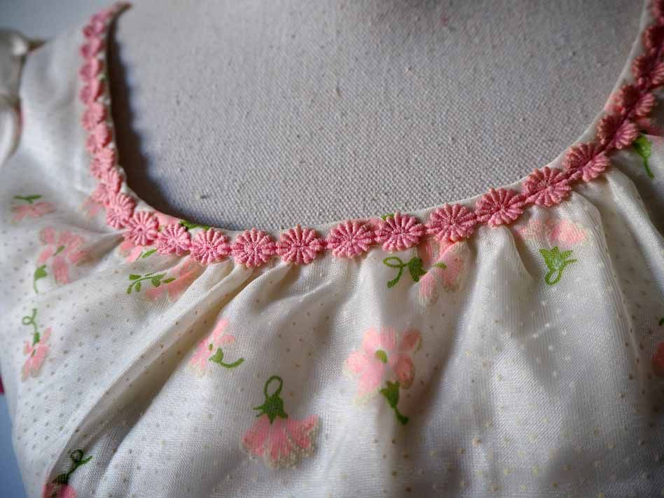 Galons de broderies roses sur le col, sous la poitrine et en bas de la partie jupe.