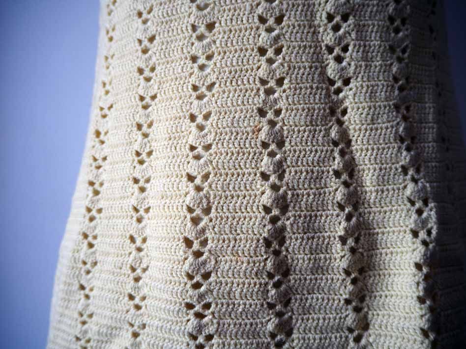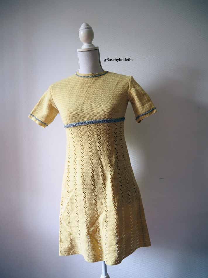 Cette petite robe est confectionnée main en crochet jaune pâle (encore une fois les tons pastels étaient à la mode dans les sixties !). Doublure en synthétique.
