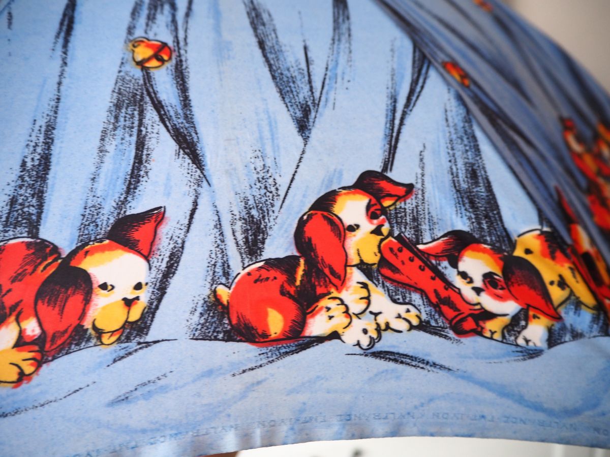 Motifs plutôt kitsch, bleu clair avec des petits chiens qui jouent.