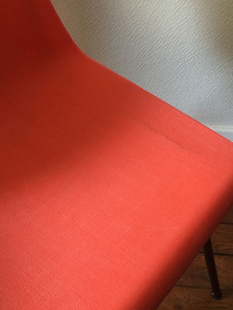 Bon état général avec quelques marques d’usure dues au temps (légères traces sur l’assise du fauteuil, fêlure infime sur la chaise / cf photos).