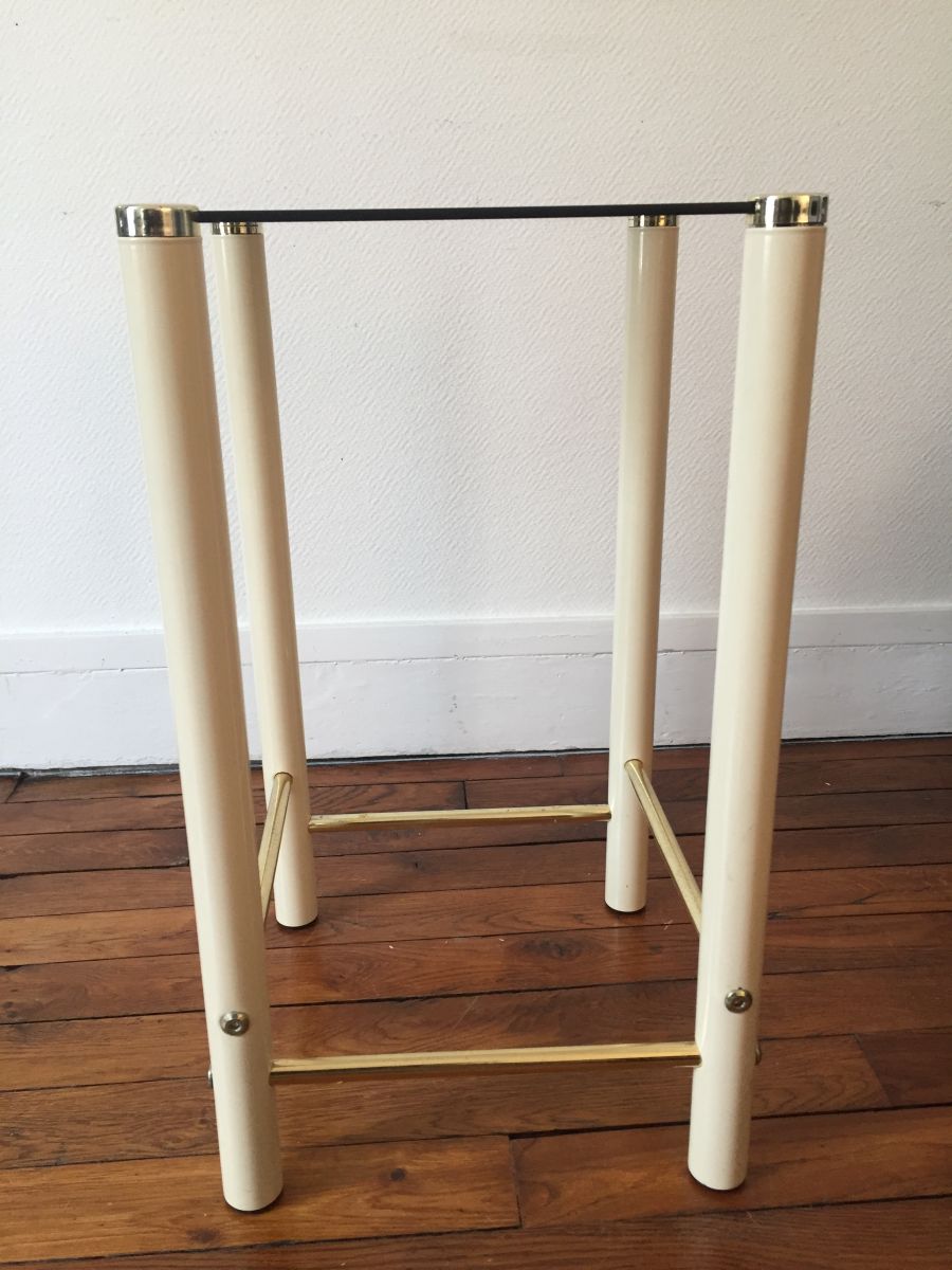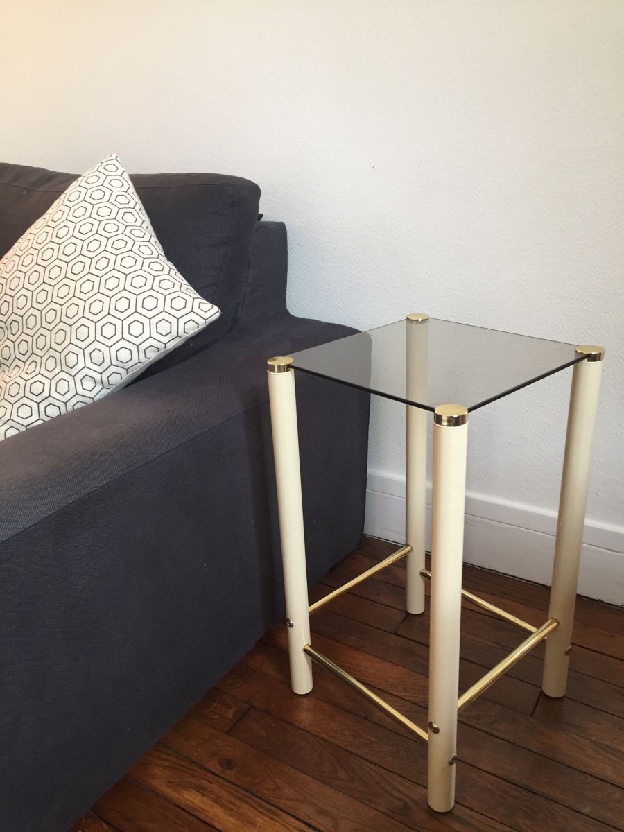 Structure tubulaire en métal, attache doré & plateau carré en verre.
