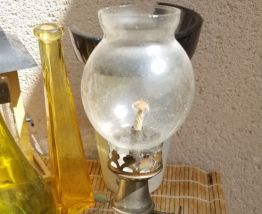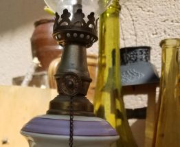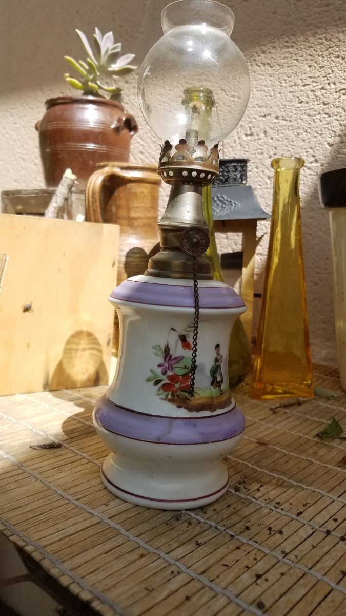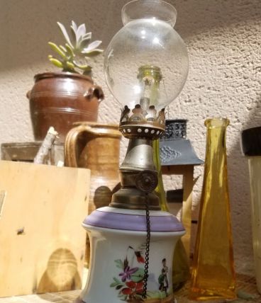 Adorable lampe à pétrole. Pied en porcelaine