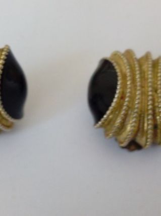 Clips d'oreille vintage. Pierre noire et métal or vielli.