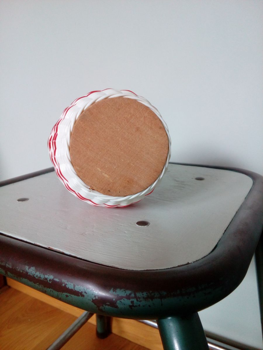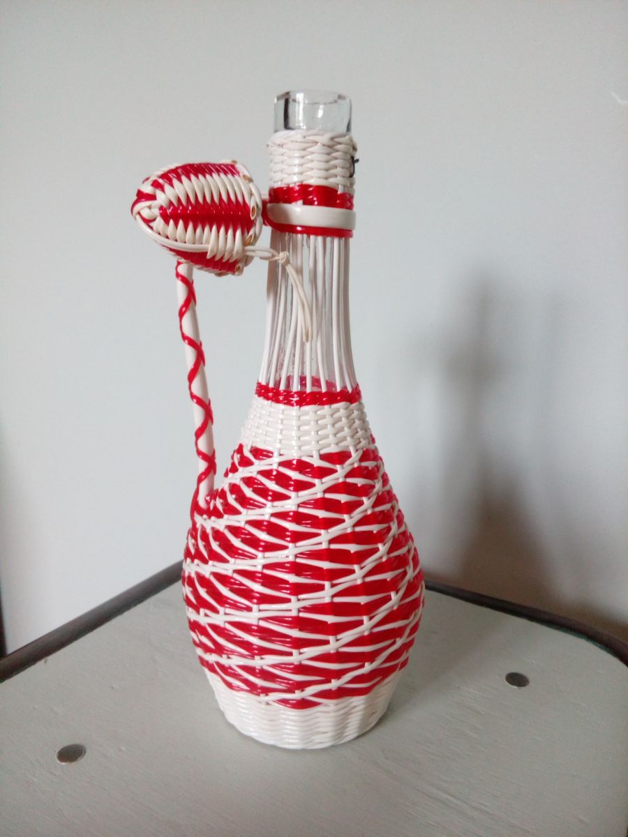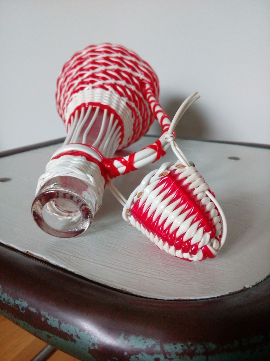 Jolie carafe ou bouteille scoubidou, si typique des années 70. Elle est très décorative avec ses couleurs blanche et rouge. Elle a une jolie forme élancée et un peu galbée. L'anse est, elle aussi, couverte de fils scoubidou, ce qui n'est pas toujours le cas mais qui est beaucoup plus joli. Elle possède encore son capuchon. Elle est en verre transparent et possède un socle en bois. Elle est en bon état, très propre, aucun fil cassé. Il manque peut-être une petite boucle en fil scoubidou, au niveau du col de la bouteille, pour assurer la fermeture avec la boucle du capuchon. Elle mesure 26 cm de haut sans le capuchon, 29 avec et 11 cm de diamètre au plus fort du renflement. Elle pèse environ 500g.