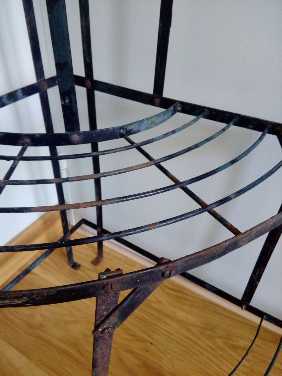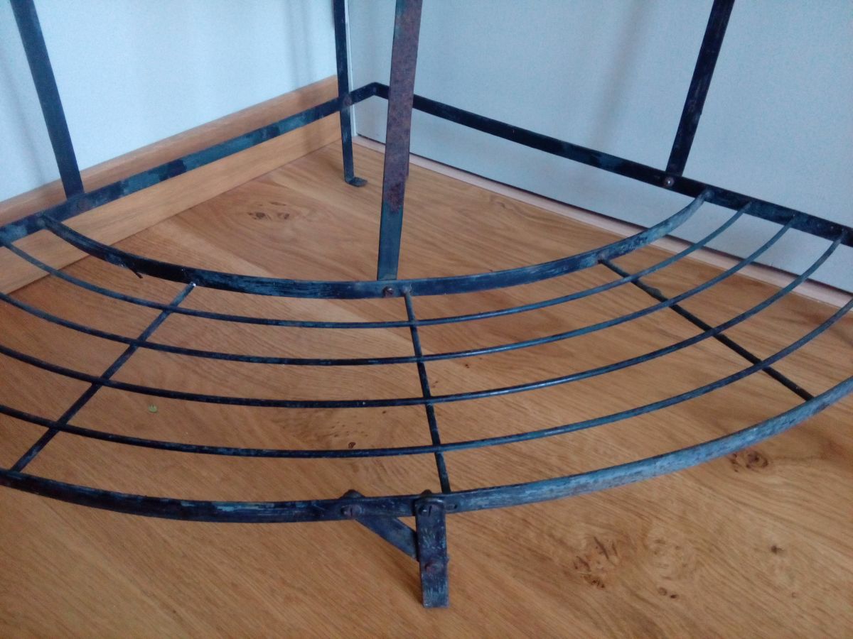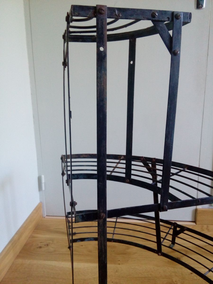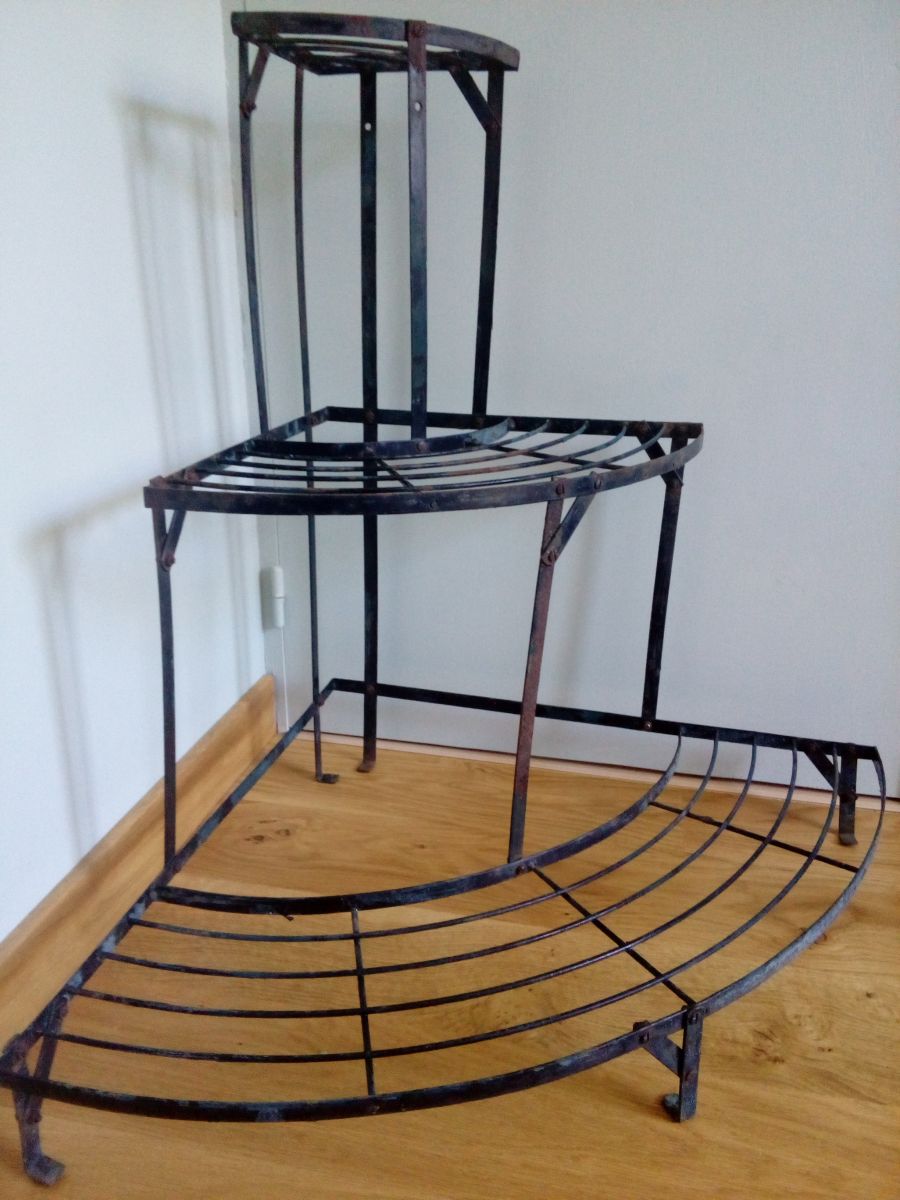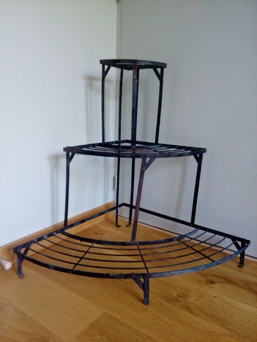 Étagère d'angle en fer, présentoir à plantes de fleuriste à trois niveaux. Solide, mais dans son jus, avec la patine de son âge : rouille (superficielle), peinture noire qui s'écaille largement et laisse le métal à nu (tons gris bleutés), taches et traces diverses. J'ai ajouté deux couples de vis et écrous qui étaient manquants. A l'origine, ces présentoirs étaient démontables, mais les vis étant rouillées, je préfère laisser celui-ci en un morceau pour l'envoi. 74 cm au plus haut, les étagères sont à 10 cm de hauteur, 42 cm de hauteur et 74 cm. 60 cm de rayon au niveau de l'étagère basse et 83 cm d'un « angle externe » à l'autre. 5 kg (difficile à peser précisément).