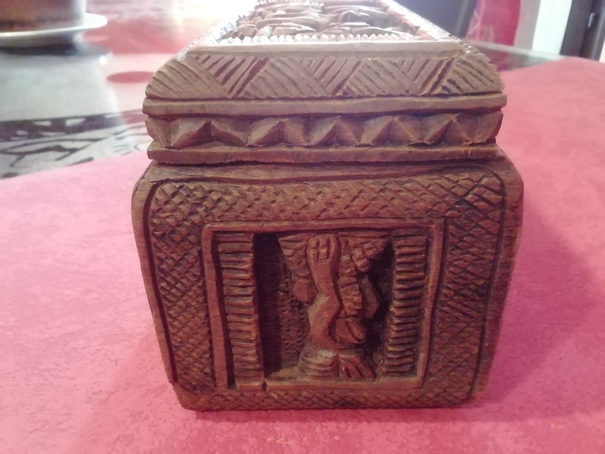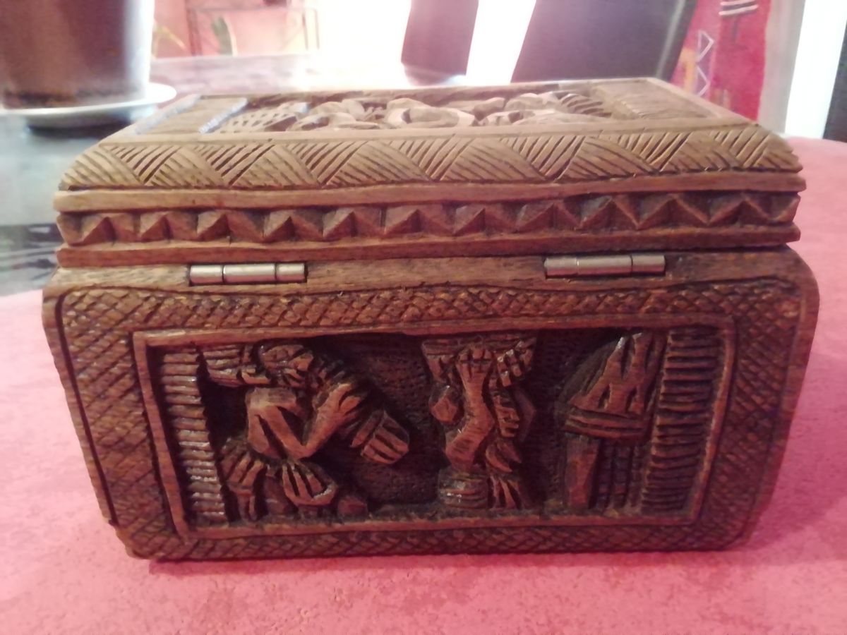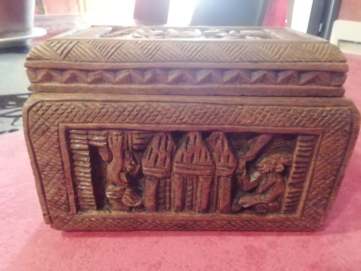 coffret sculpté bois scène de la vie longueur 17.5 cm largeur 10 cm hauteur 12 cm