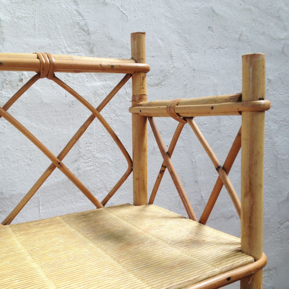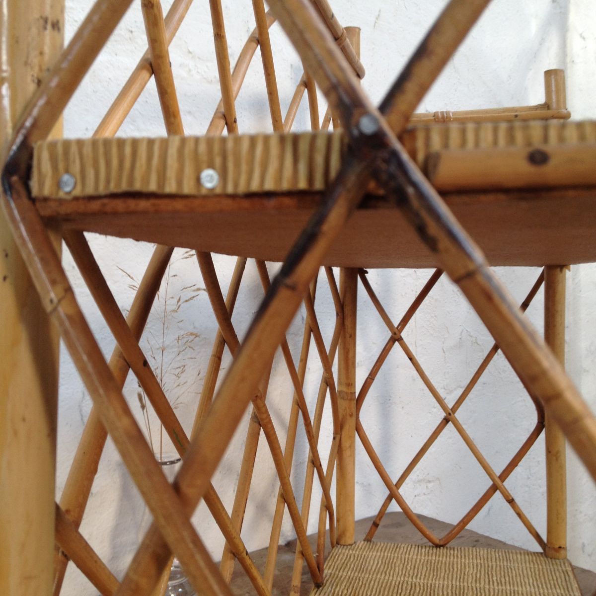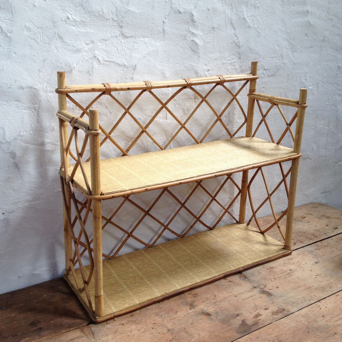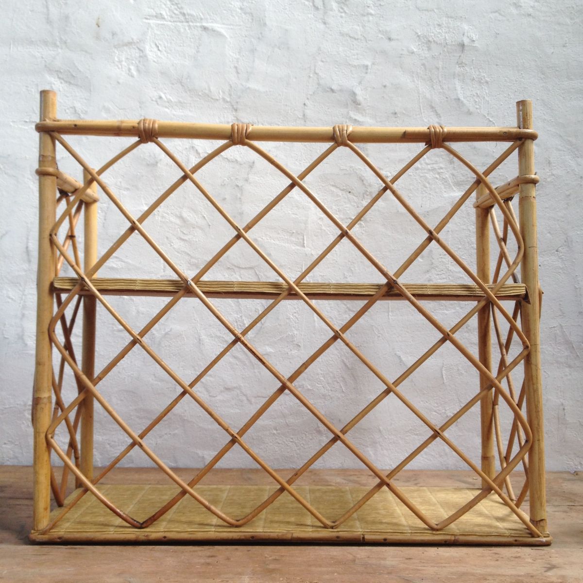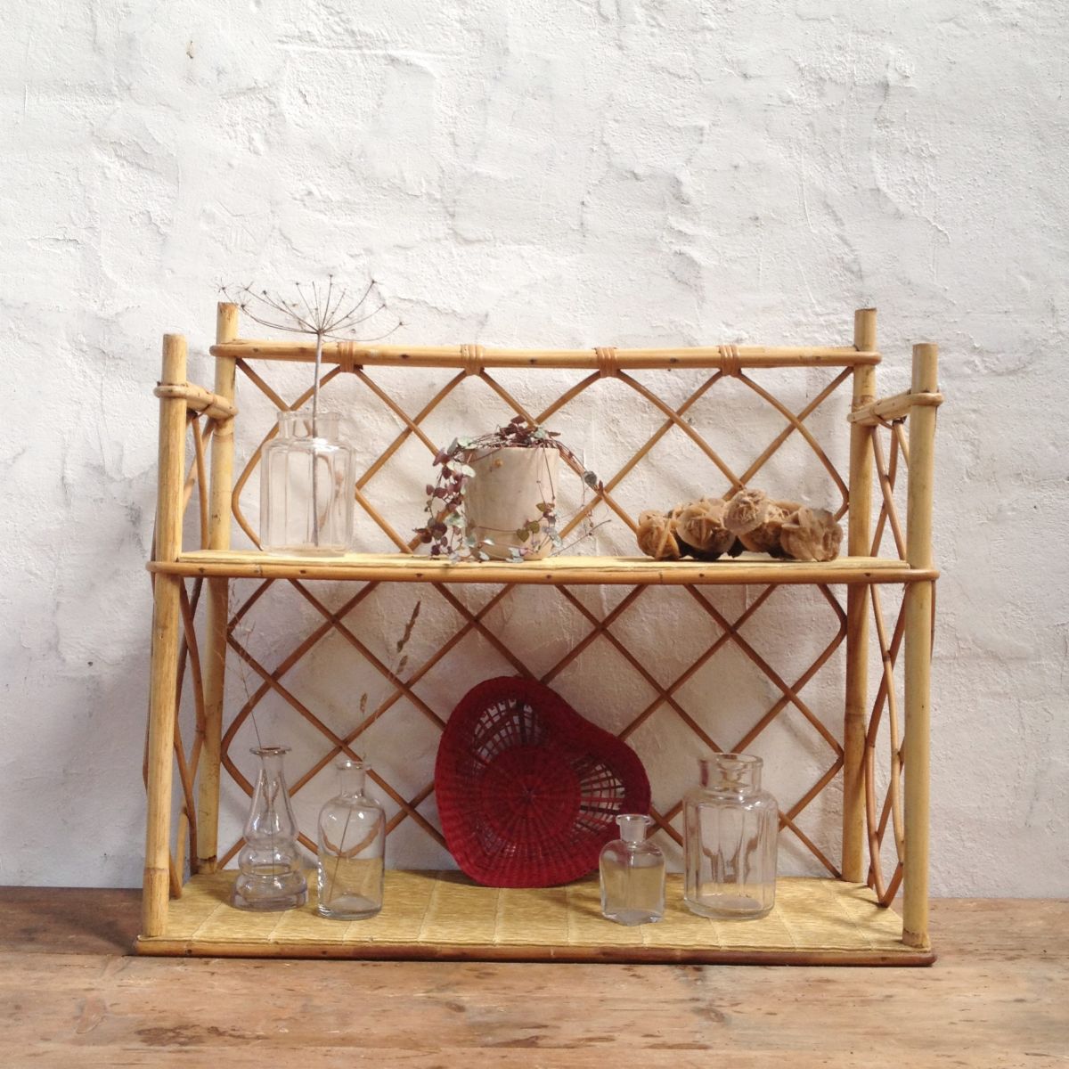 Jolie petite étagère vintage en rotin. Pratique avec ses deux niveaux, à poser ou à suspendre, elle ira aussi bien dans une entrée, une cuisine, une salle de bain, une chambre d'enfant... A noter une petite restauration sur un des côtés, peu visible et bien faite. Elle mesure 49cm de hauteur, 56cm de largeur et 20cm en profondeur.