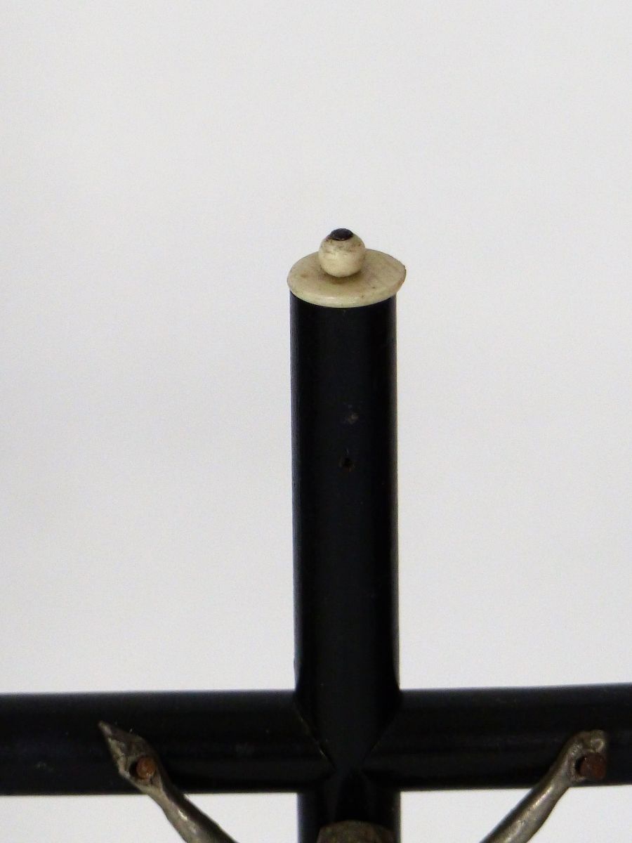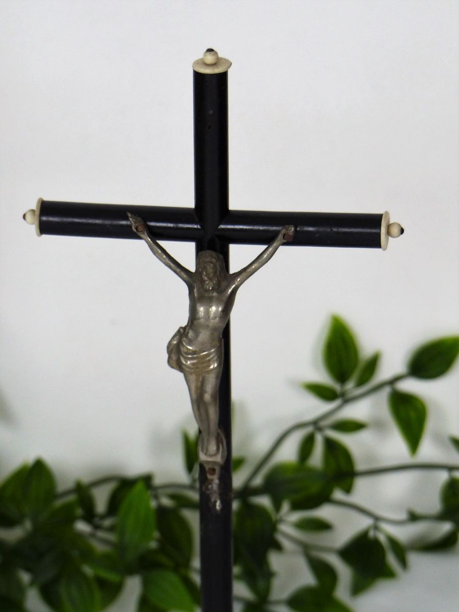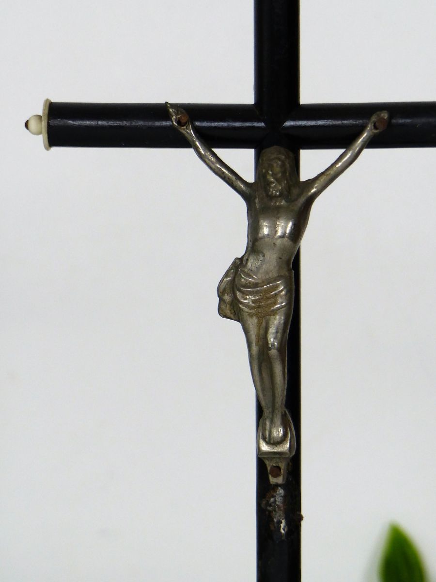 Objet décoratif religieux, croix en bois peinte en noir, Christ en aluminium. Dimensions : Largeur 13 cm, Hauteur 30 cm