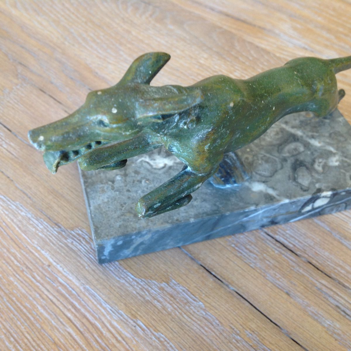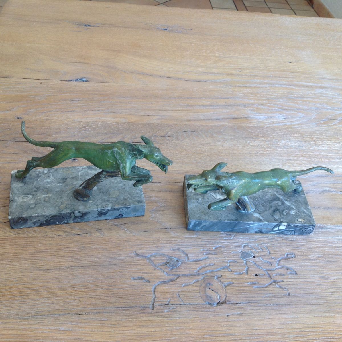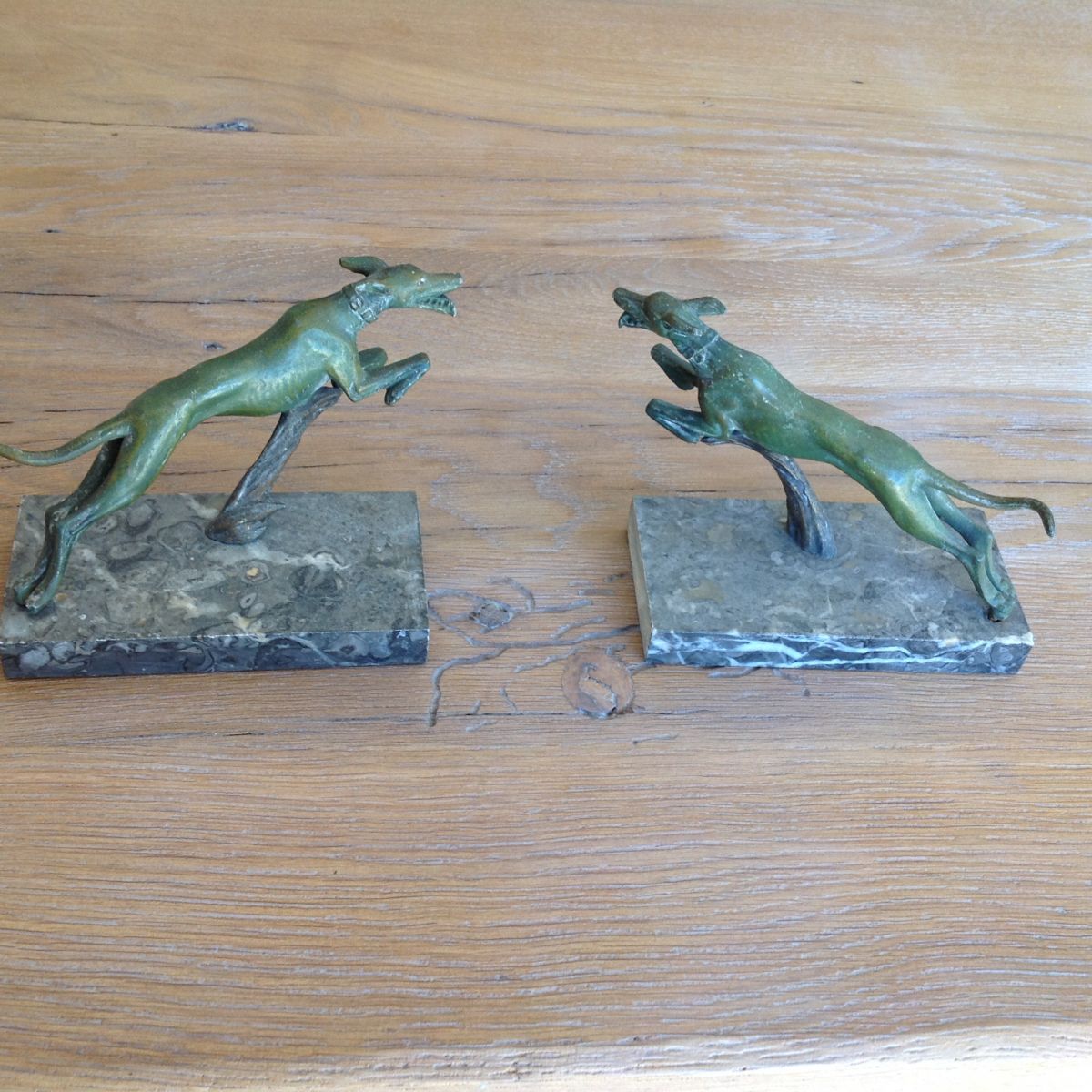 Serre livres : lévriers en bronze sur socle en marbre ( ton gris ) dimensions : hauteur avec socle environ 12cm / socle 15x7,5 cm. Poids : l'un 1,020 kg , l'autre 1,035 kg