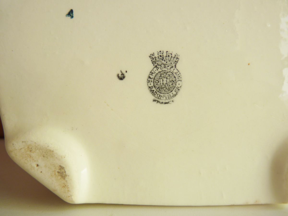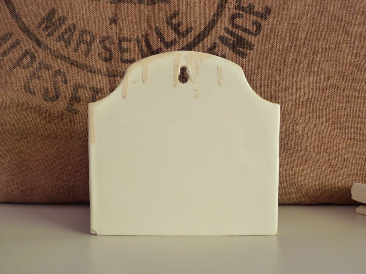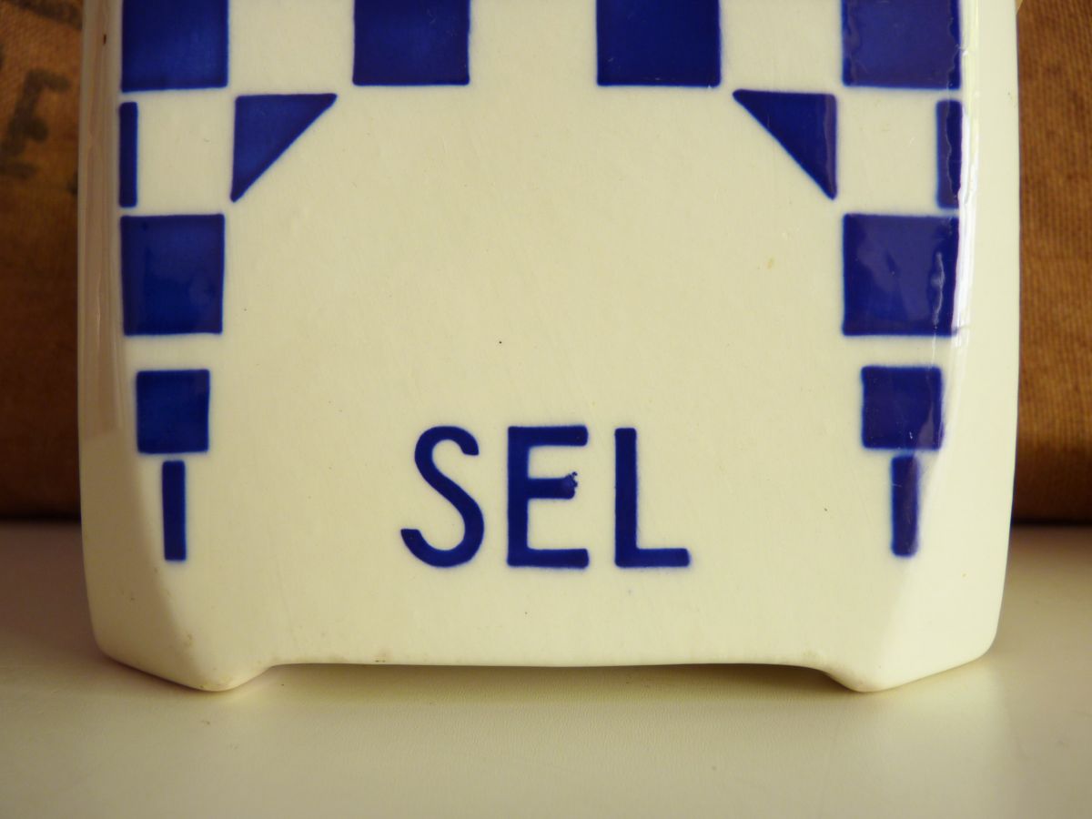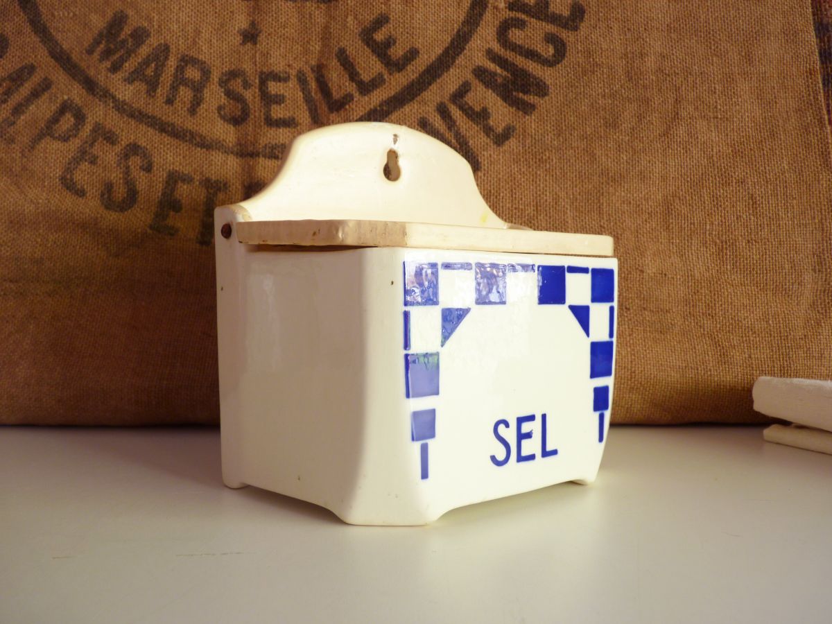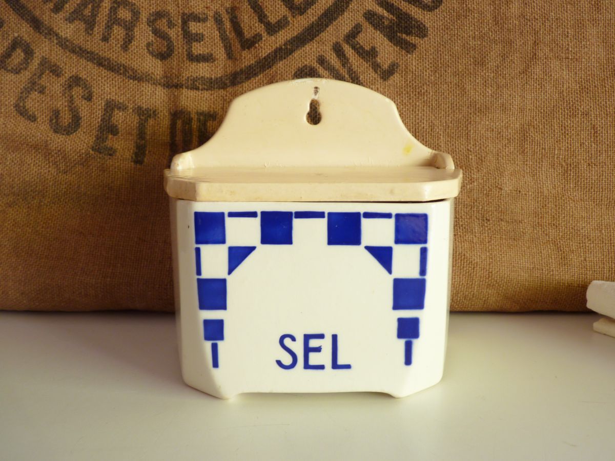 Boîte à sel en porcelaine de Badonviller avec accroche murale. Style Lustucru