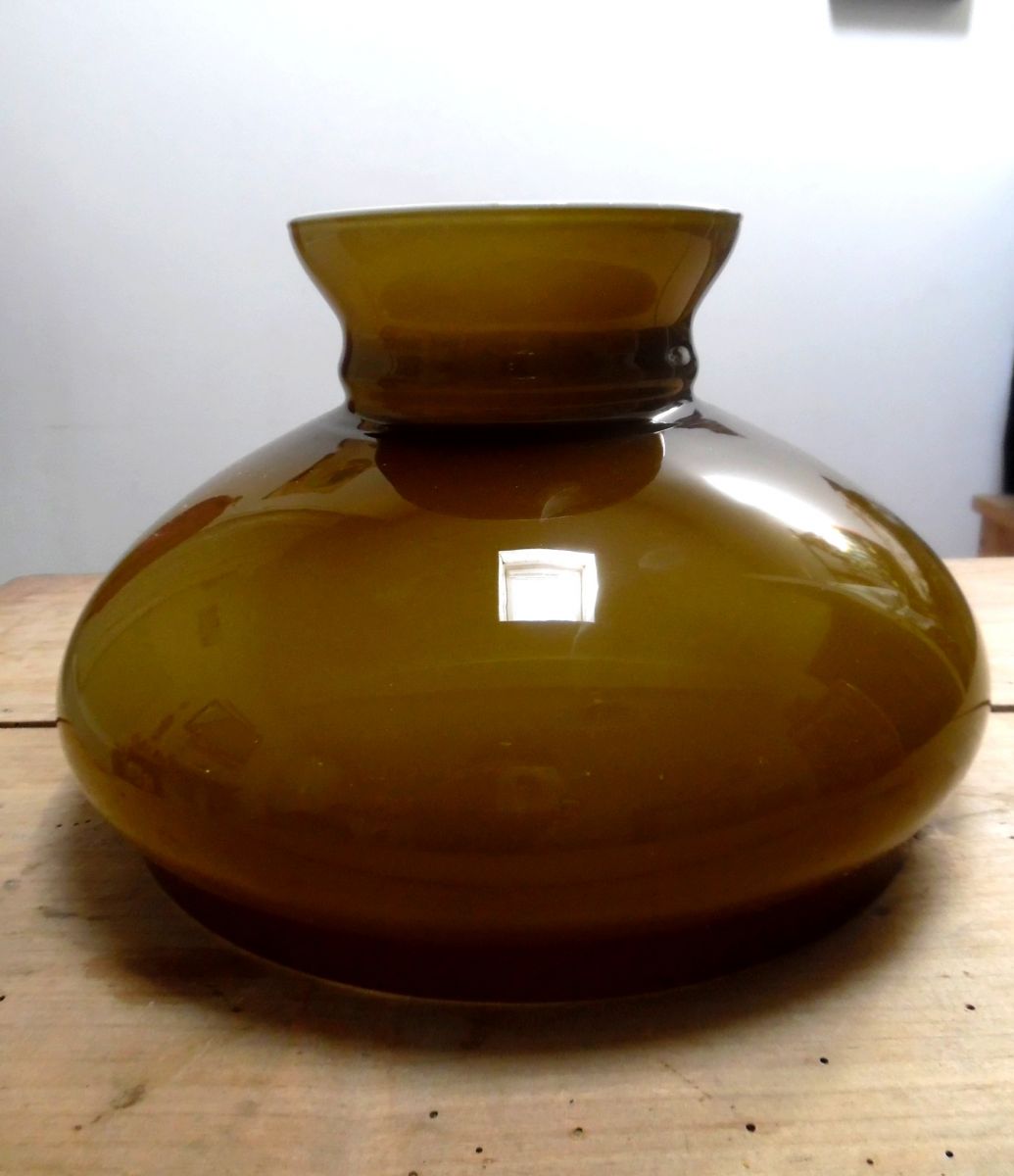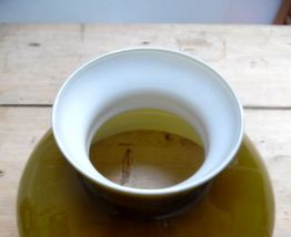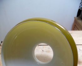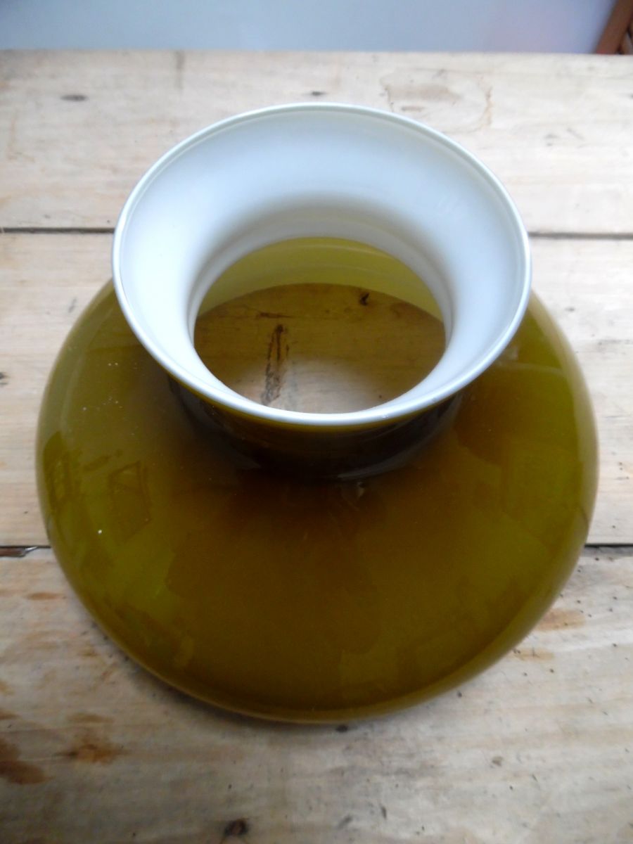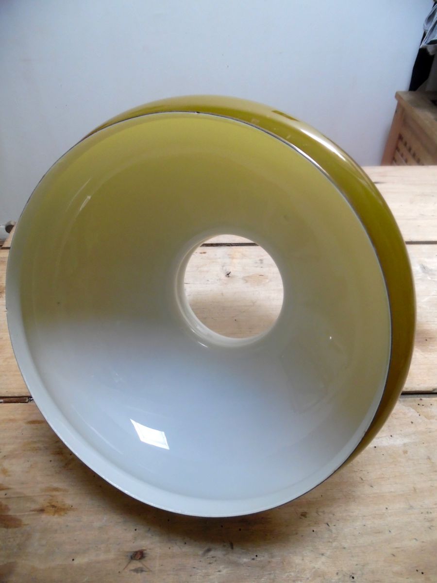 jolie suspension en opaline blanche à l'intérieur et vert kaki à l"extérieur,très belle dans une cuisine vintage